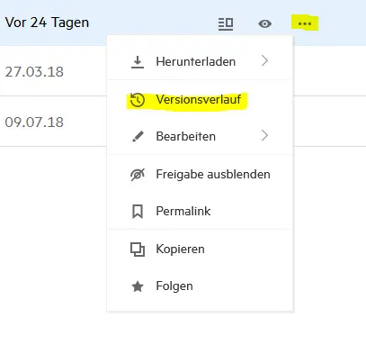 Es werden die Versionen der letzten zehn Tage vorrätig gehalten. Dazu markieren Sie die Datei und klicken auf die ... am rechten Rand.