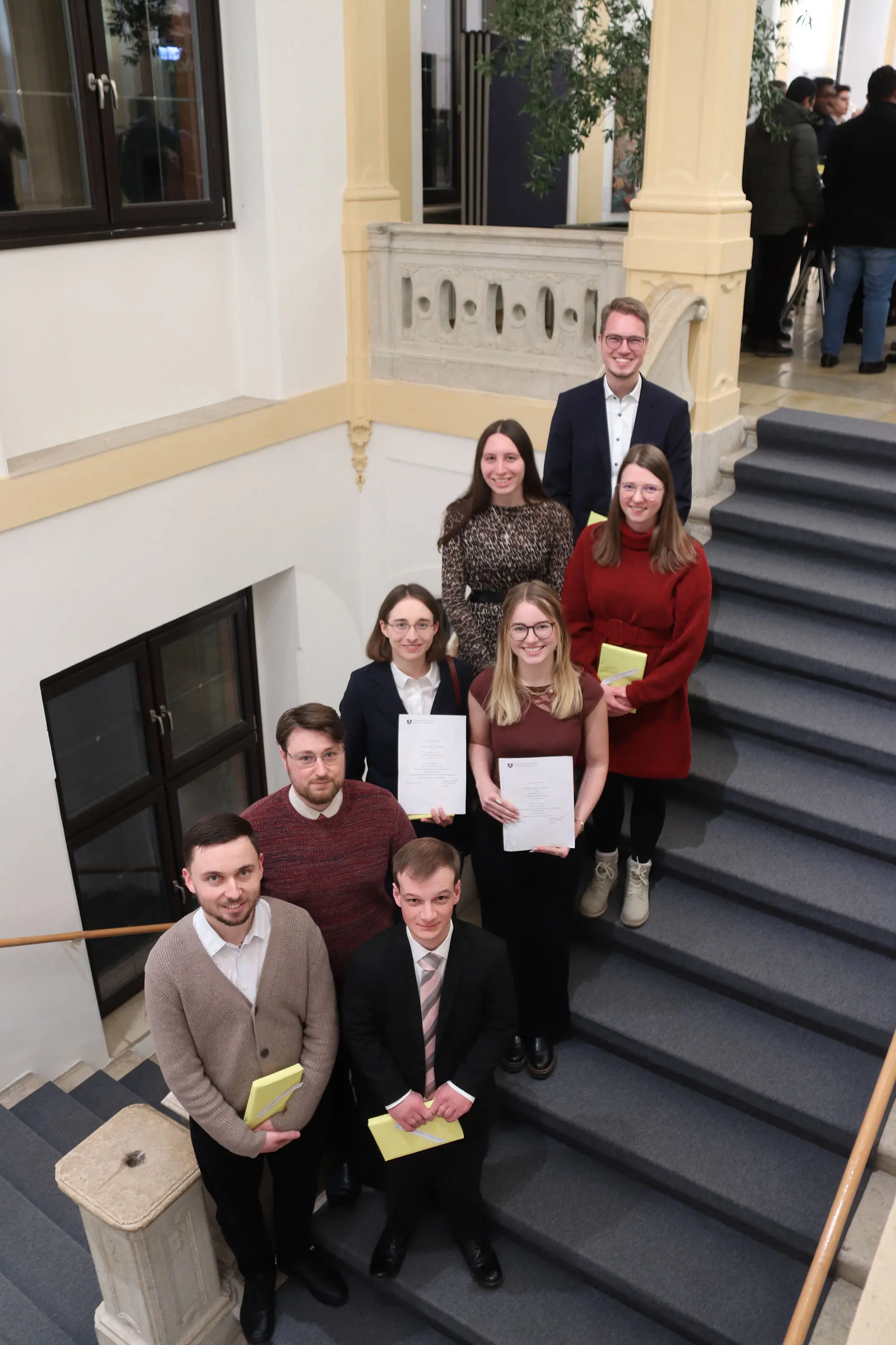 Abschließend stellten die Doktorväter der verschiedenen Lehrstühle die Arbeiten der insgesamt fünf Promovenden der Fakultät, die 2025 ihren Doktortitel erhielten, jeweils kurz vor. Von den Promovenden war für das anschließende Foto nur Benedikt Rauw anwesend. Der wissenschaftliche Mitarbeiter am Lehrstuhl für Moraltheologie feierte mit seiner gesamten Familie die erfolgreiche Promotion.