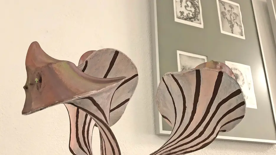 Neben den Malereien stellen die druckgrafischen Werke einen Schwerpunkt der Ausstellung dar. Die Frottagen und Decalcomanien generieren durch den Einsatz raumbildender Mittel eine besondere Sogwirkung und Tiefe. Die Hochdrucke und Kaltnadelradierungen hingegen zeugen von einem intensiven Naturstudium und entführen den Betrachter in die Welt der Flora. Diese Formensprache wird von den organischen Strukturen der pilzartigen Plastiken aus Draht und Stoff aufgegriffen und in den dreidimensionalen Raum überführt.