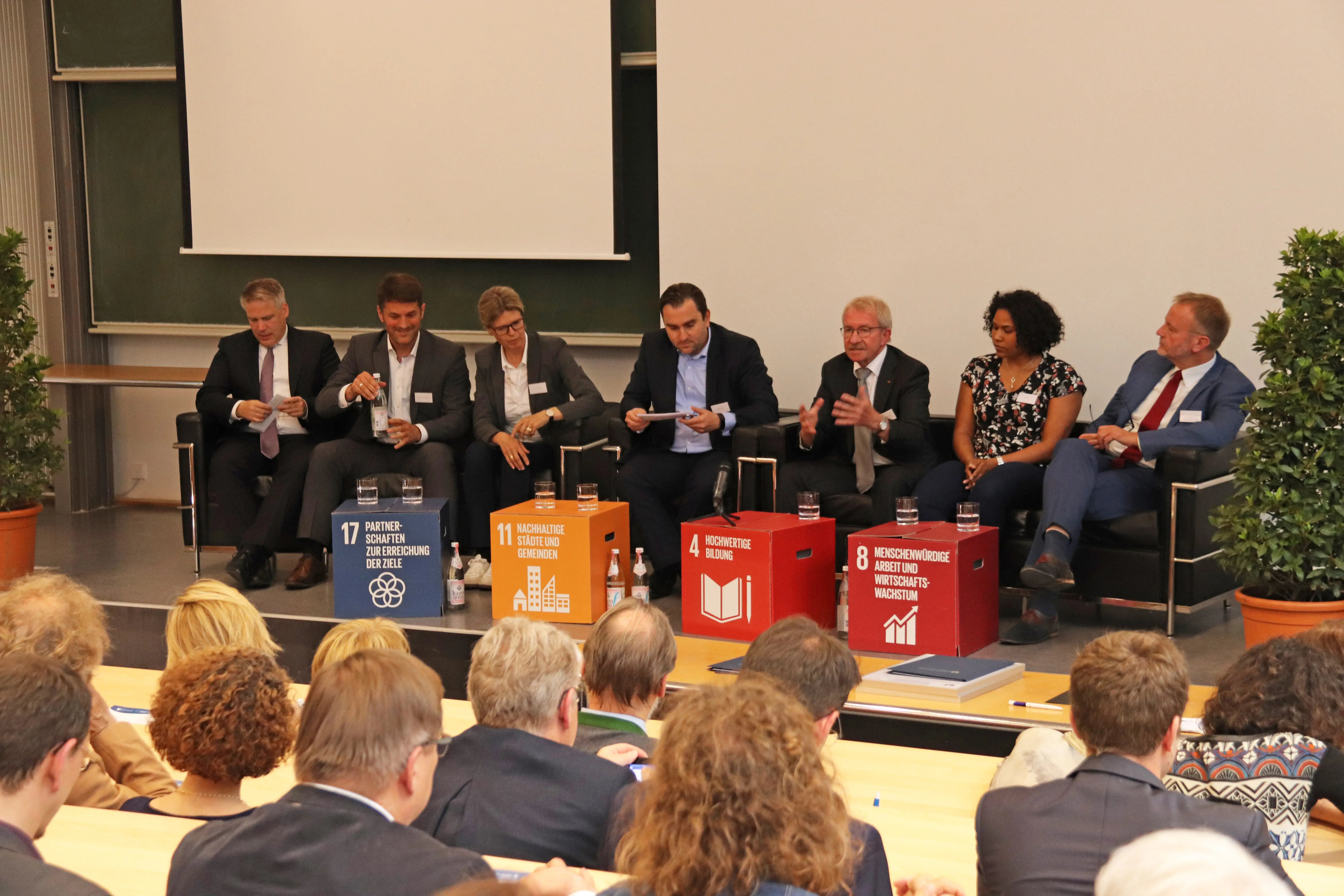 Prof. Dr. André Habisch (KU) wies darauf hin, dass entscheidende Weichenstellungen auch außerhalb des direkten Einflussbereichs im globalen Rahmen getroffen würden, wenn etwa die brasilianische Regierung wirtschaftliche Interessen über den Schutz des Regenwaldes stelle. Zugeständnisse für Nachhaltigkeit müssten zum Teil auch durch höhere Preise erkauft werden. Auch Prof. Dr. Georg Barfuß (THI) forderte eine ehrliche Diskussion darüber, dass adäquate Bedingungen entlang globaler Lieferketten mit Kosten verbunden seien. Für einen pragmatischen Ansatz warb die Studentin Denise Rink, die vor kurzem gemeinsam mit anderen Kommilitonen der THI den Verein „Out Future“ gründete: „Wir sollten weniger reden und mehr machen. Wir haben eine Chance, wenn es genügend Menschen gibt, die wenigstens einen Wandel hin zu Nachhaltigkeit probieren.“