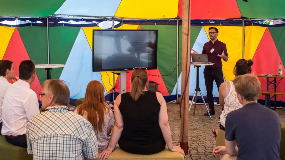 Das Rahmenprogramm im Zirkuszelt mit Impuls-Vorträgen und Diskussionsrunden bot zudem Anregungen rund um das Thema Engagement. Prof. Dr. Rico Behrens, Professor für Politische Bildung an der KU, stellte Forschungsergebnisse zum politischen Engagement von Jugendlichen vor und diskutierte über dieses Thema auf dem Podium mit Klaus Bittlmayer, dem Jugendbeauftragten der Stadt Eichstätt, dem Vorsitzenden des Kreisjugendrings Manfred Muthig, dem Landessekretär der Evangelischen Landjugend Bayern, Manfred Walter, sowie den beiden engagierten Studierenden Christoph Paschen und Jana Jergl. Impulse und Austausch boten auch weitere Beiträge und ein Schnupperseminar der KU und weiterer Gäste rund um die Themen Lernen, Bildungsgerechtigkeit und Freiwilligendienste.