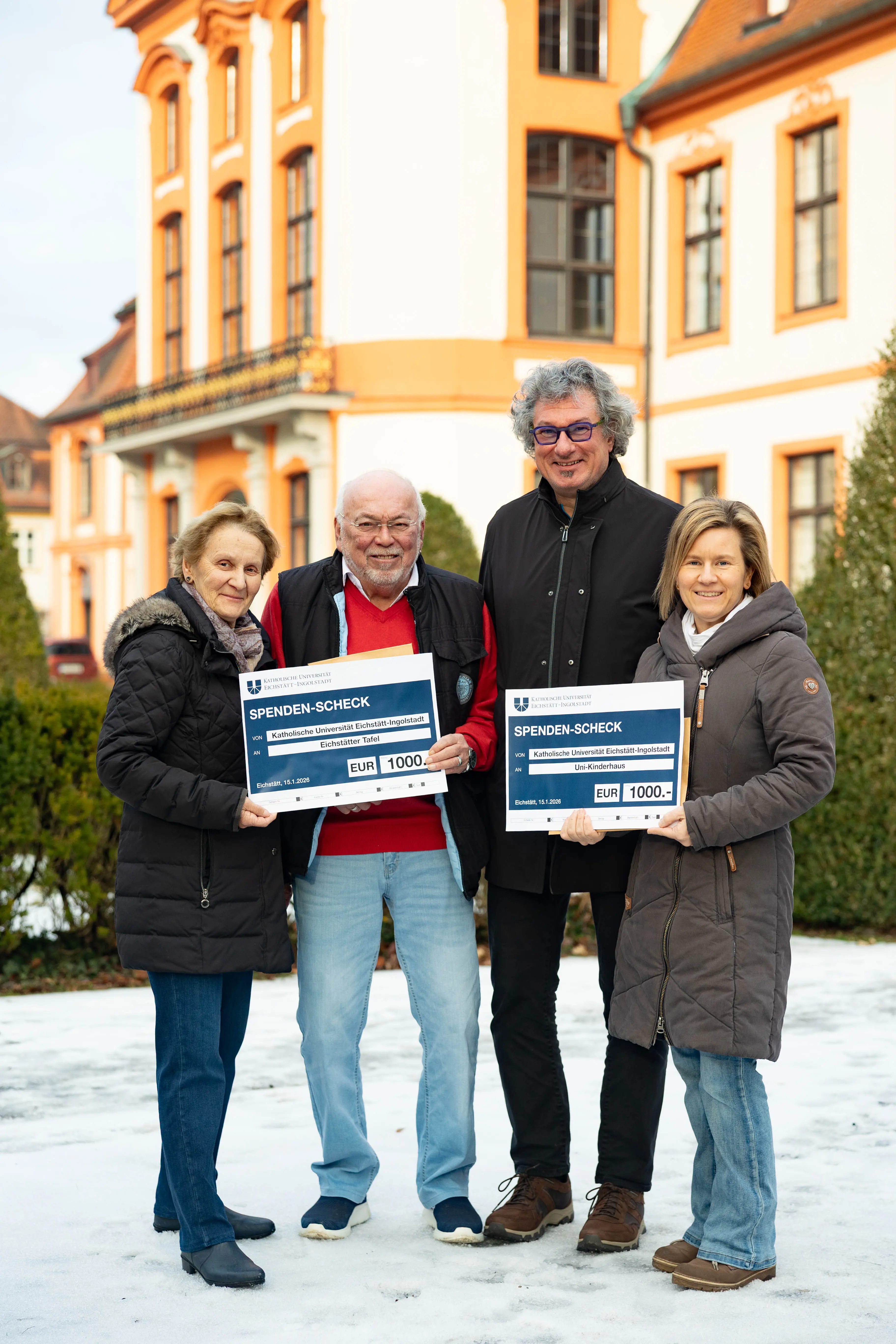 Doris Keim, die das Uni-Kinderhaus leitet, nahm ebenfalls einen Spendenscheck entgegen. Die Tagesstätte für Kinder von Studierenden und Beschäftigten der KU möchte mit dem Geld Motorikboards für die musikalische Früherziehung beschaffen.