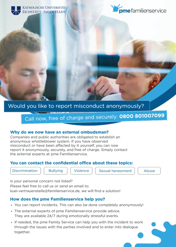 If you experience discrimination, bullying, violence, sexual harassment, or abuse, you can contact an external and confidential support service. The pme Familienservice is available by phone at 0800 801007099 or via email at kuei-vertrauenstelle@familienservice.de. More information can be found in the flyer.