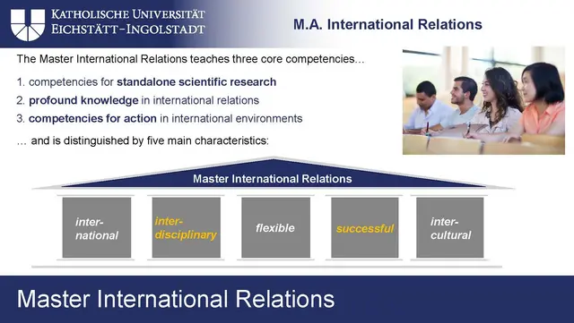 The Master’s degree program in International Relations at the KU is interdisciplinary, international, flexible, successful and intercultural. The purpose of this program is to scientifically and thoroughly examine international politics as well as advanced topics in the fields of international law, political science, history and sociology. It teaches three core competencies: the ability to work independently, an in-depth knowledge of international relations, and the ability to perform in international contexts. The interdisciplinary program attracts students from all over the world, who can tailor their studies to their needs and their career goals thanks to the program’s flexible structure. Seminars can optionally be taken in English. The Master's program comprises 120 ECTS credits with the standard period of study being four semesters.