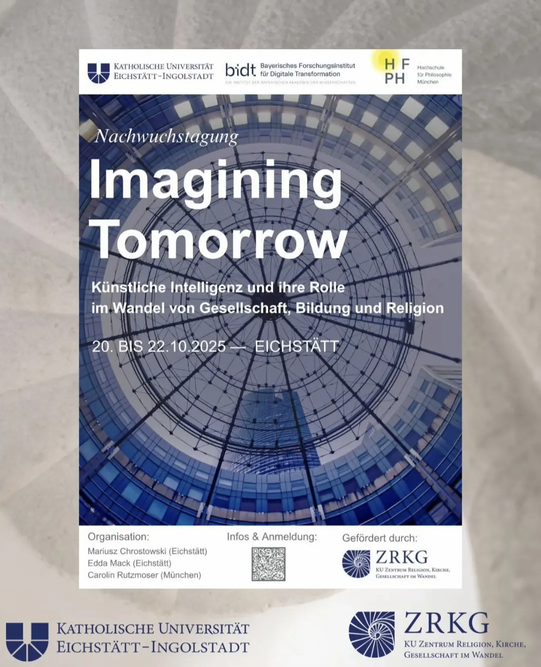 From October 20 to 22, 2025, the early-career conference “Imagining Tomorrow”: Artificial Intelligence and Its Role in the Transformation of Society, Education, and Religion took place in Eichstätt. The event was supported by the Center for Religion, Church, and Society in Transition (ZRKG) and organized by Dr. Dr. Mariusz Chrostowski, Dr. Edda Mack, and Dr. Carolin Rutzmoser.