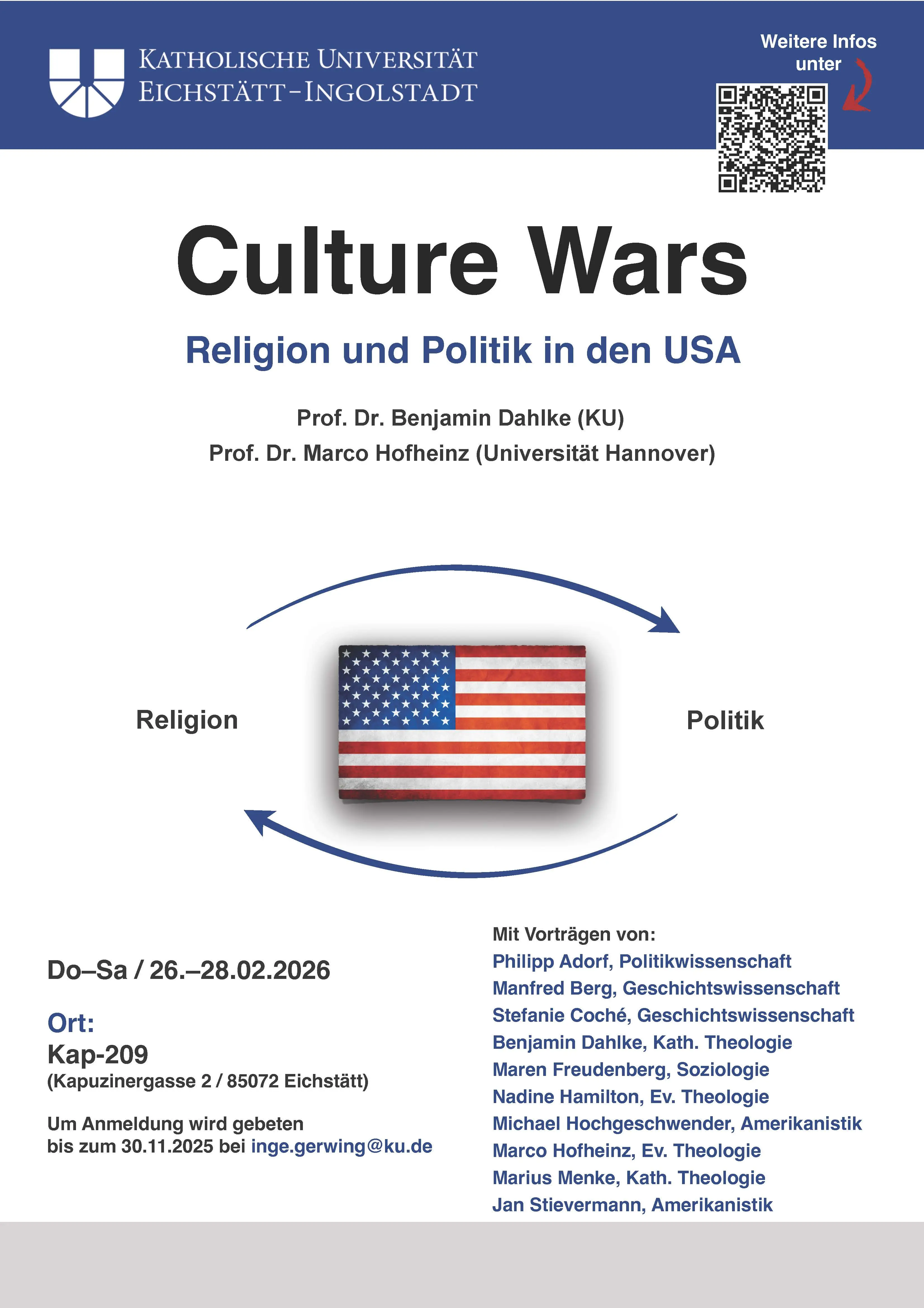 Following these traces, the conference invites an interdisciplinary analysis of the culture wars and the significance of the relationship between Christian religion and politics for the “culture war” in the US, which also serves as a mirror for corresponding developments in Europe.