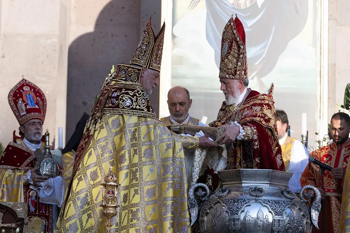 Nur alle sieben Jahre findet in der Armenischen Apostolischen Kirche die feierliche Zeremonie der Myronweihe statt, die allein dem Katholikos aller Armenier vorbehalten ist. Eigentlich wäre es bereits 2022 wieder so weit gewesen. Doch aufgrund der kriegerischen Auseinandersetzungen mit Aserbaidschan und wegen der Umbauarbeiten in der Kathedrale wurde der Termin verschoben. Am 28. September 2024 nahm Karekin II. schließlich zusammen mit zwölf armenischen Bischöfen aus der ganzen Welt die Myronweihe vor.