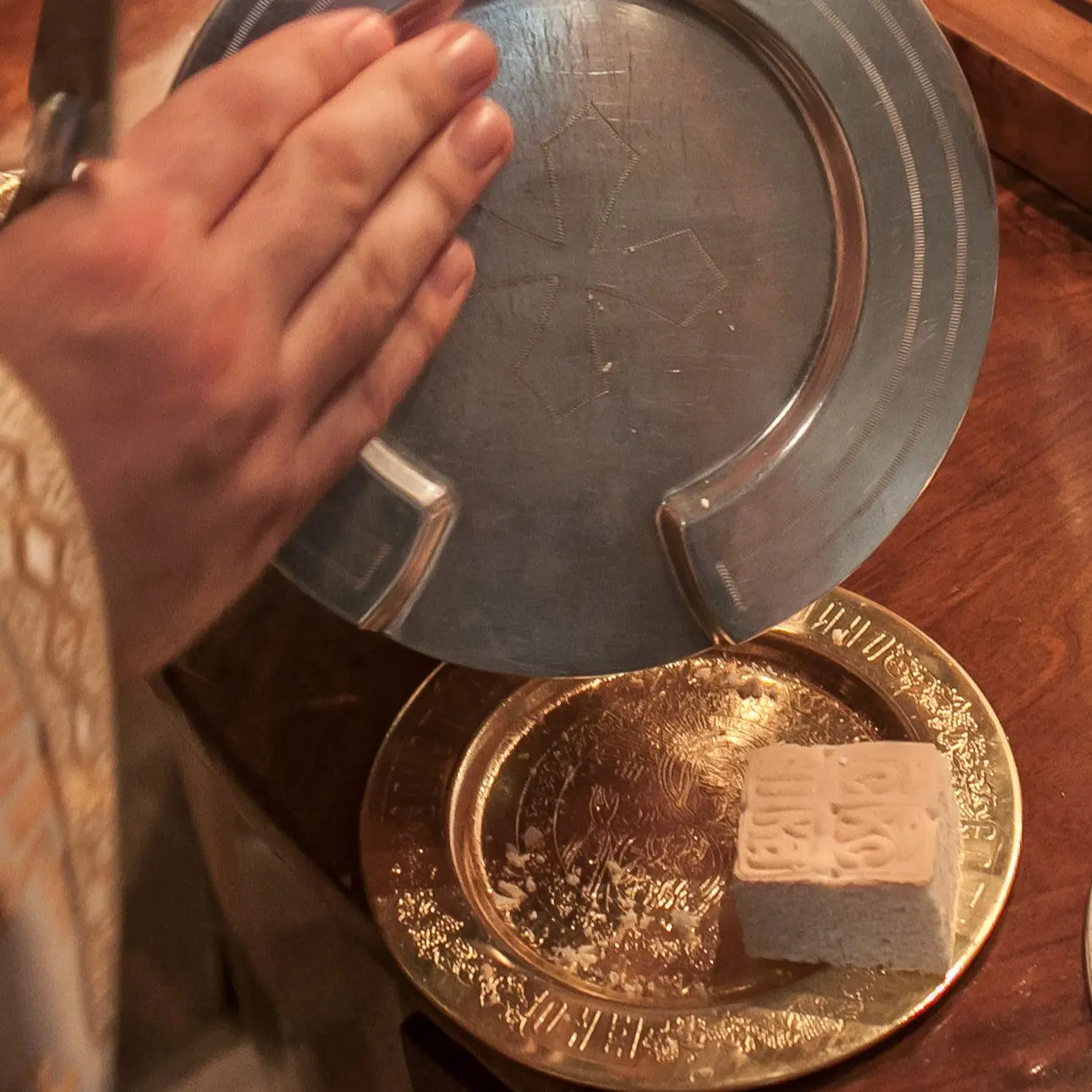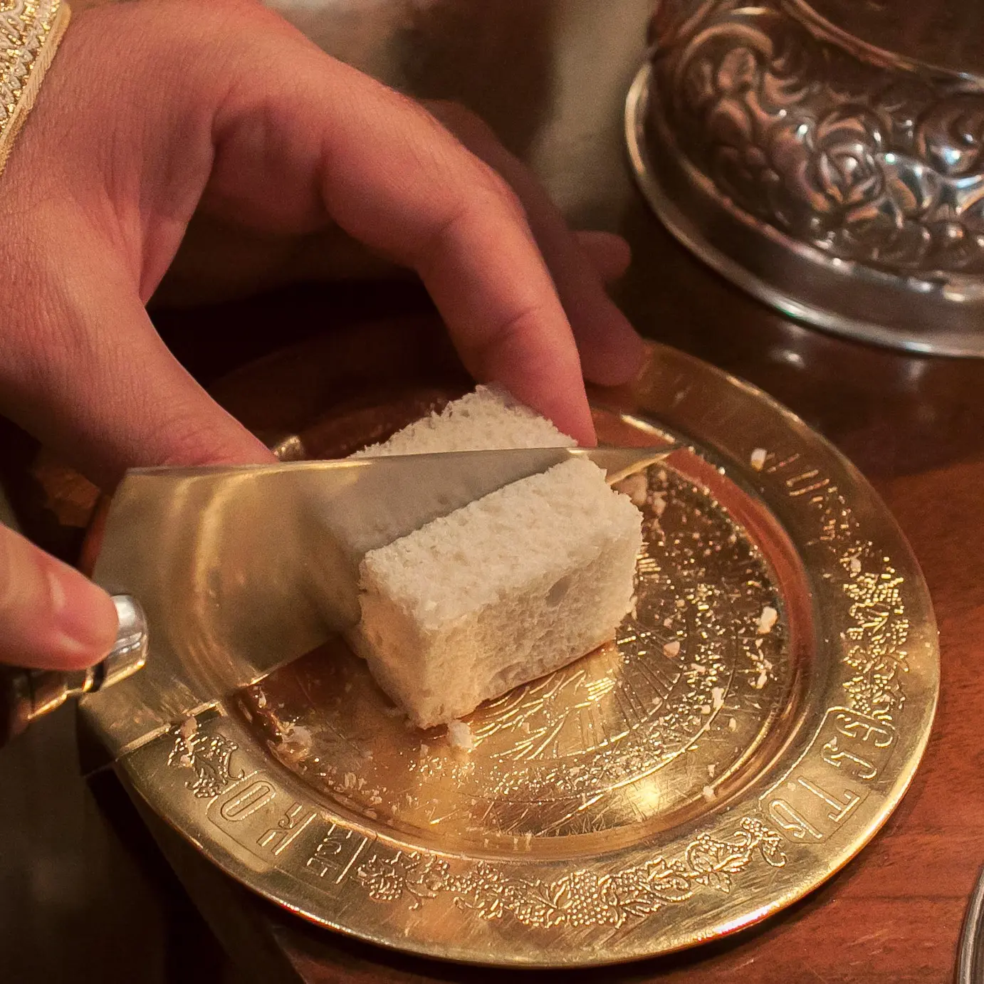Er reinigt den Teller aud den Diskos, damit kein Krümel vom Prosphoron verloren geht.