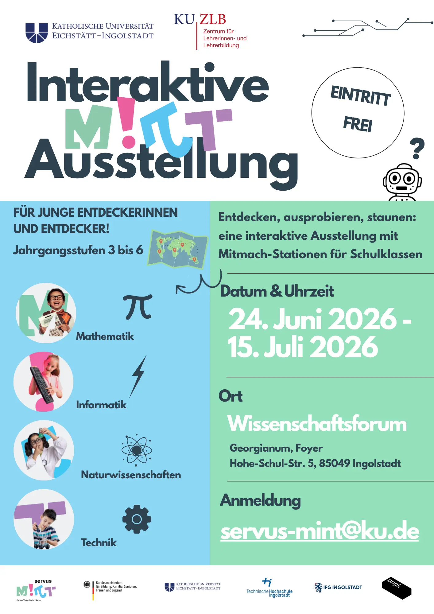 Die Ausstellung richtet sich an Schulklassen aller Schularten der Jahrgangsstufen 3 bis 6 (ca. 8–12 Jahre) und versteht sich als inklusives Angebot, das unterschiedliche Interessen, Lernvoraussetzungen und Zugänge berücksichtigt. Die Ausstellung möchte Neugier fördern, abstrakte Themen praktisch erfahrbar machen und Berührungsängste abbauen, um MINT-Bildung für alle Kinder zugänglich zu gestalten.