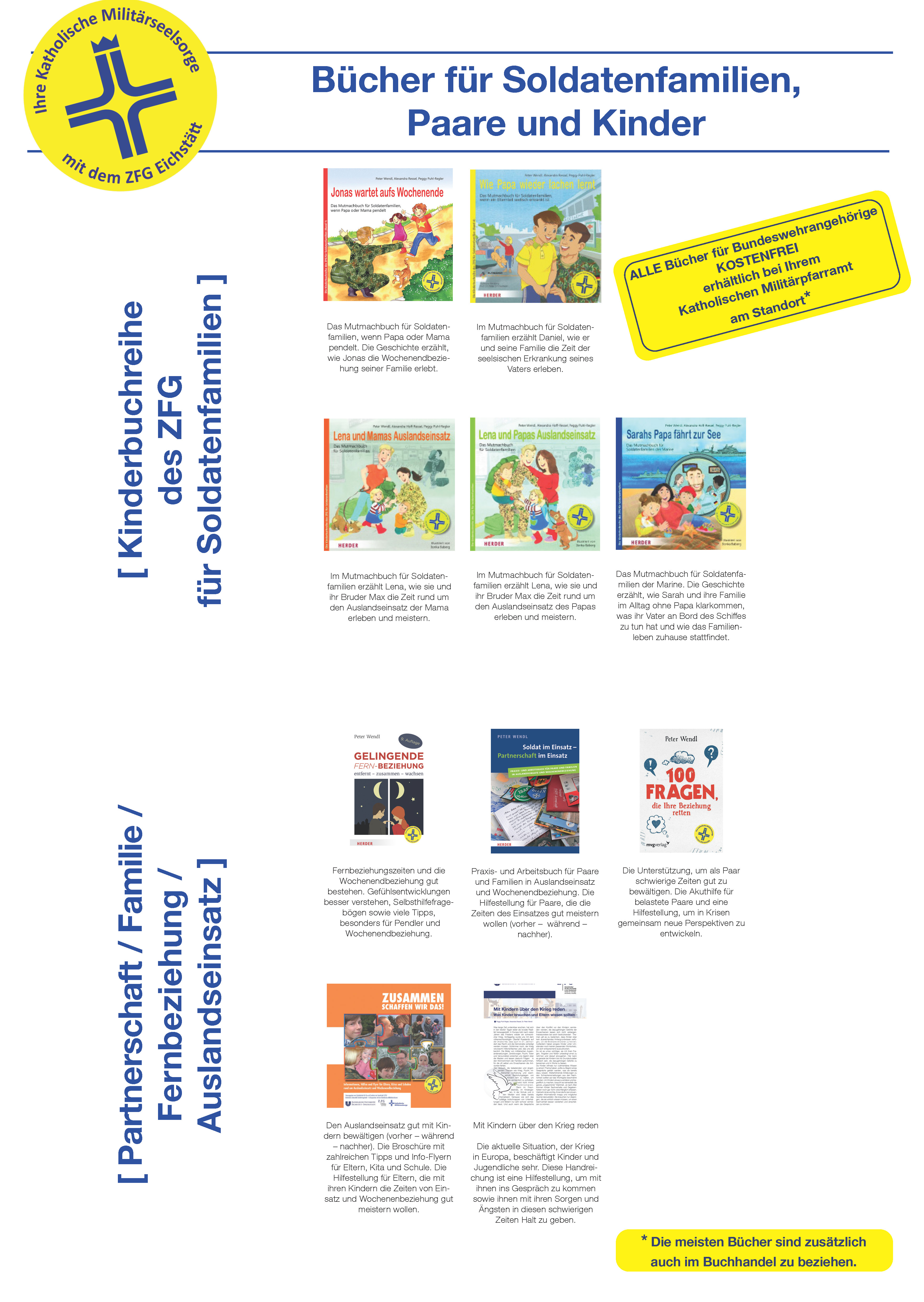 Alle Publikationen sind für Bundeswehrangehörige kostenlos beim Katholischen Militärpfarramt am Standort erhältlich. Die meisten Bücher sind zusätzlich kostenpflichtig über den Buchhandel zu beziehen.