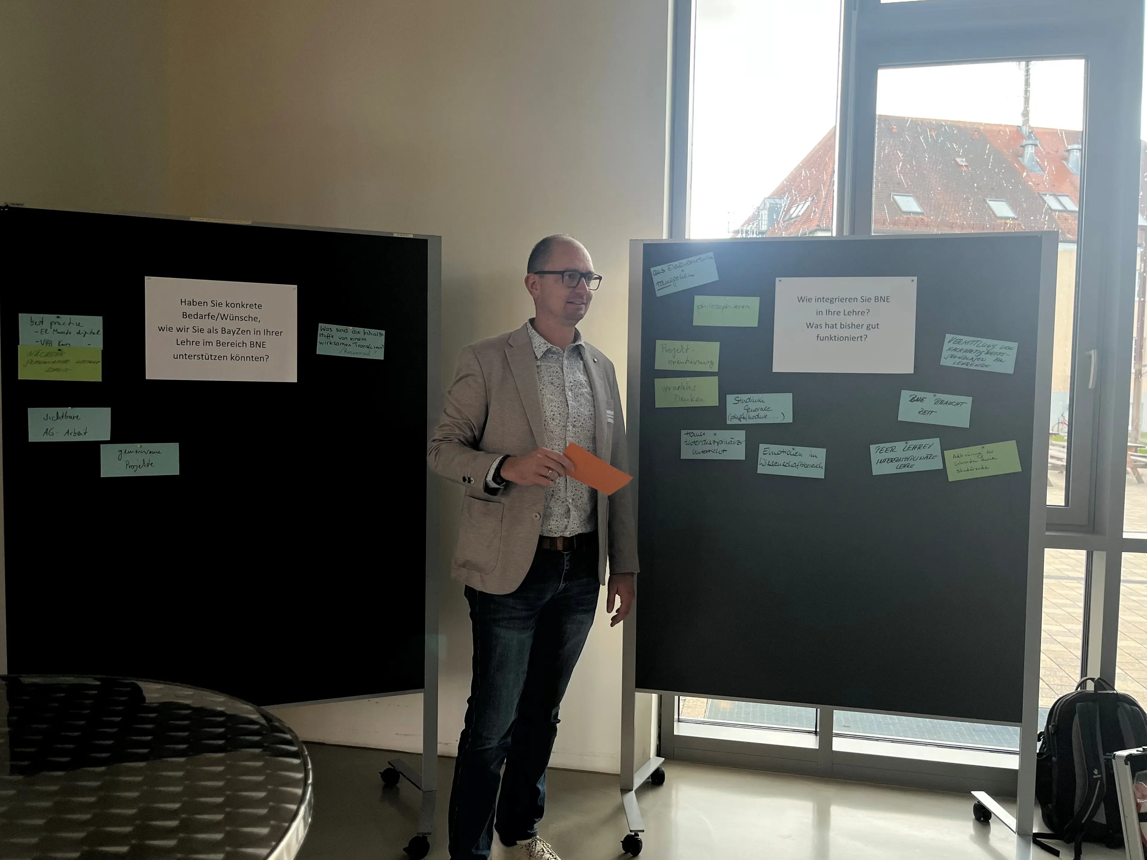 Am Nachmittag luden Prof. Dr. Jan Hiller (KU Eichstätt-Ingolstadt), Noemi Pappenberger-Münch und Richard Pilhofer (beide Hochschule für Musik Nürnberg) zum innovativen und interaktiven Format „Walk’n’Talk – BNE in der Lehre gemeinsam denken“ ein. In mehreren Gesprächsrunden schlenderten die Teilnehmenden über den grünen Campus in Freising und tauschten sich dabei über Chancen, Hürden und Best Practice der BNE in der Hochschullehre aus. Die gesammelten Ergebnisse werden im Nachgang des Treffens in den AK Hochschullehre des BayZeN eingehen.