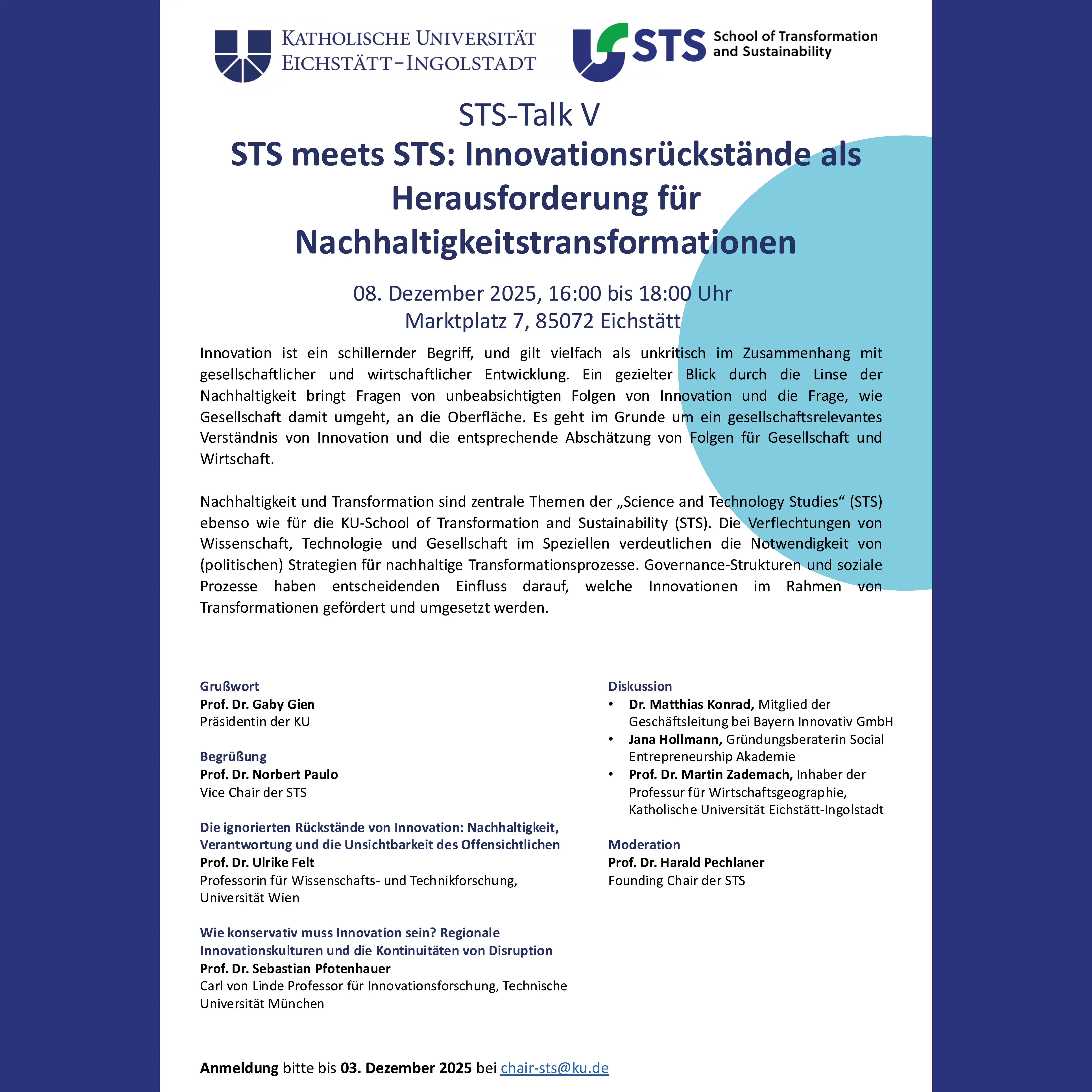 Am 8.12. findet der 5. STS Talk „Innovationsrückstände als Herausforderung für Nachhaltigkeitstransformationen” der School of Sustainability and Transformation der KU statt, auch mit einem Input von Hans-Martin Zademach. Alle Interessierten sind hierzu herzlich eingeladen.
