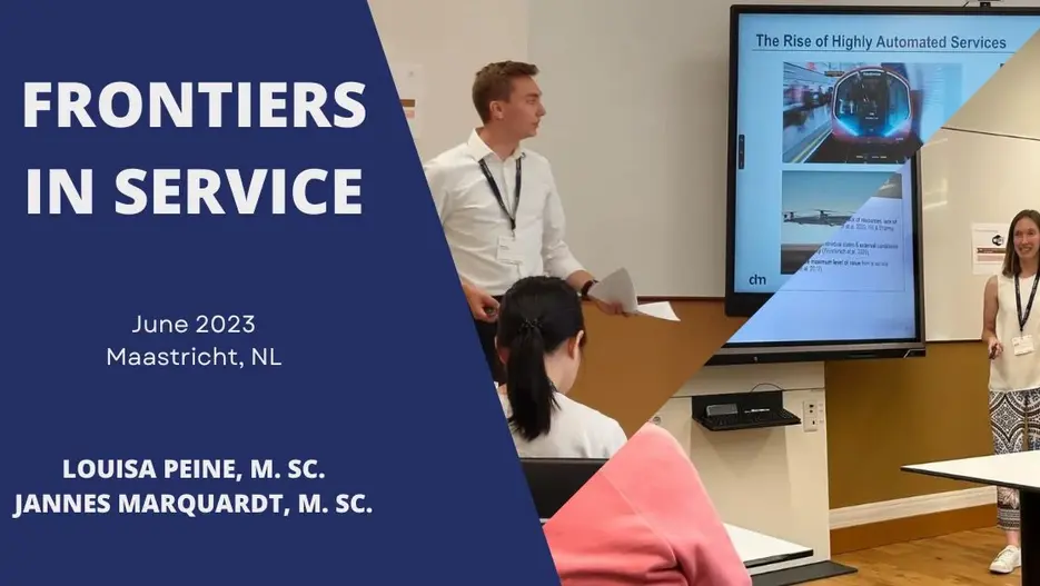 Wir freuen uns, dass unsere Doktoranden Louisa Peine und Jannes Marquardt an der diesjährigen „Frontiers in Service“-Konferenz in Maastricht teilgenommen haben. Dort präsentierten sie ihre aktuellen aktuellen Forschungsthemen „Fostering Inclusion in Techno-Mediated Service Encounters“ (Louisa Peine) und „When the customer is stressed: The Role of Loss of Control in Highly Automated Services“ (Jannes Marquardt).