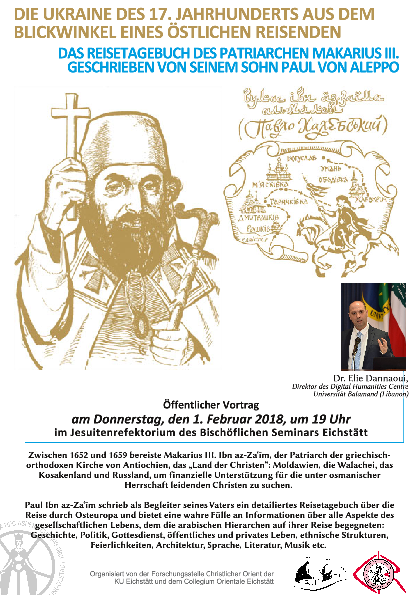 Gemeinsam mit dem Collegium Orientale lädt die Forschungsstelle zu einem Öffentlich Vortrag von Dr. Elie Dannaoui, dem Direktor des Digital Humanities Centre an der Universität Balamand (Libanon), ein. Unter dem Titel "Die Ukraine des 17. Jahrhunderts aus dem Blickwinkel eines östlichen Reisenden" wird Dr. Dannaoui am 01. Februar 2018 um 19.00 Uhr im Jesuitenrefektorium des Bischöflichen Seminars über das Reisetagebuch des rum-orthodoxen Patriarchen Makarius III., das von dessem Sohn Paul von Aleppo geschrieben wurde, sprechen.
