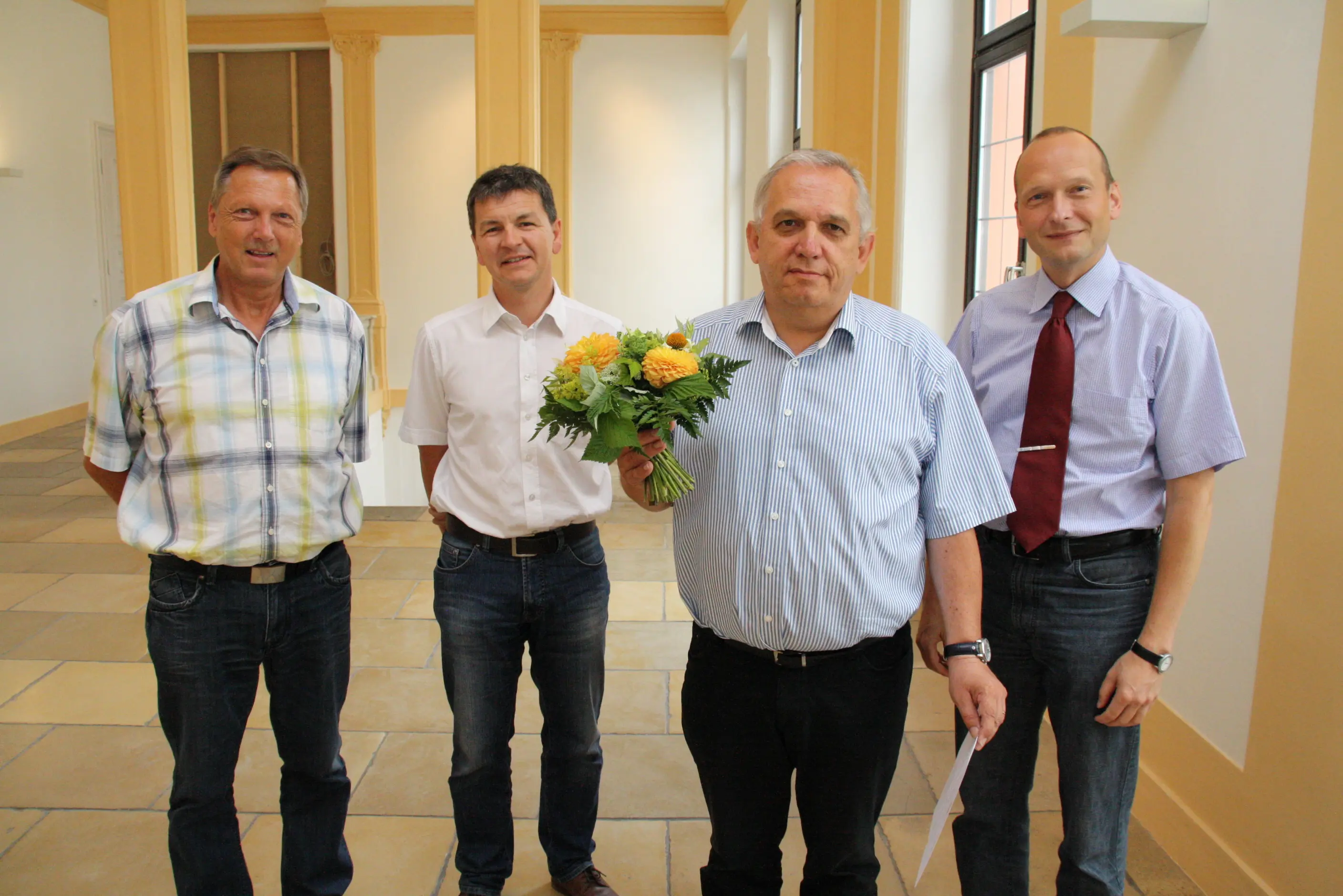 Universitätskanzler Thomas Kleinert (rechts im Bild) würdigte diese lange Zeitspanne als Ausdruck von Loyalität gegenüber der KU und beglückwünschte Niegsch im Beisein von Siegfried Hartmann, Leiter des Referats für Personalangelegenheiten des wissenschaftsunterstützenden Personals, und Eduard Breitenhuber, Leiter der Haushaltsabteilung (v.l.).