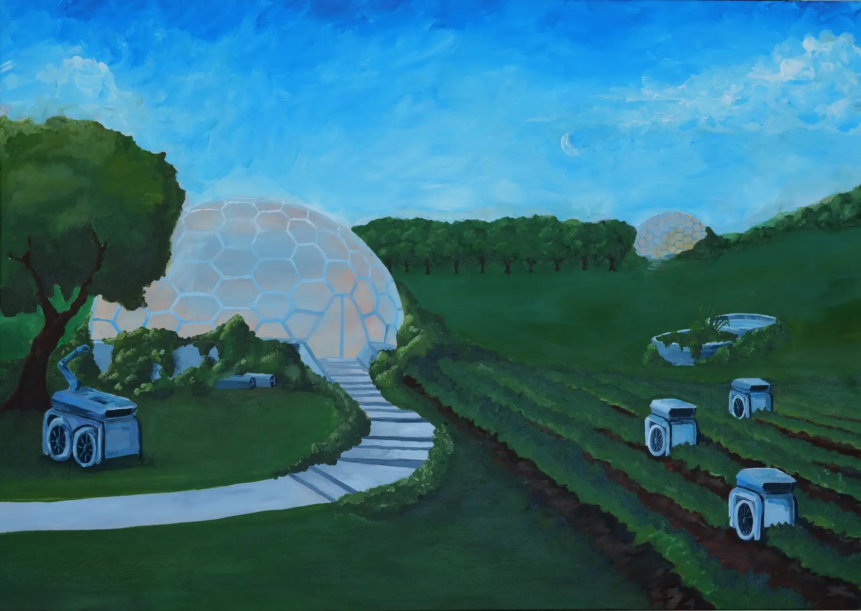 Mein Werk zeigt eine Zukunft, in der Natur und Technik im Einklang „atmen“. Grüne Hochhäuser und Wasserläufe prägen die Stadt. Sie lebt im Einklang mit ihrer Umwelt. Das Graffiti in leuchtendem Rot und Pink bricht diese Harmonie. Es erinnert daran, dass in der Ruhe auch die Freiheit der Menschen prägnant wird. „Green Cities“ ist mehr als eine Stadt: sie ist ein Raum des Wachsens und des Verbunden seins.