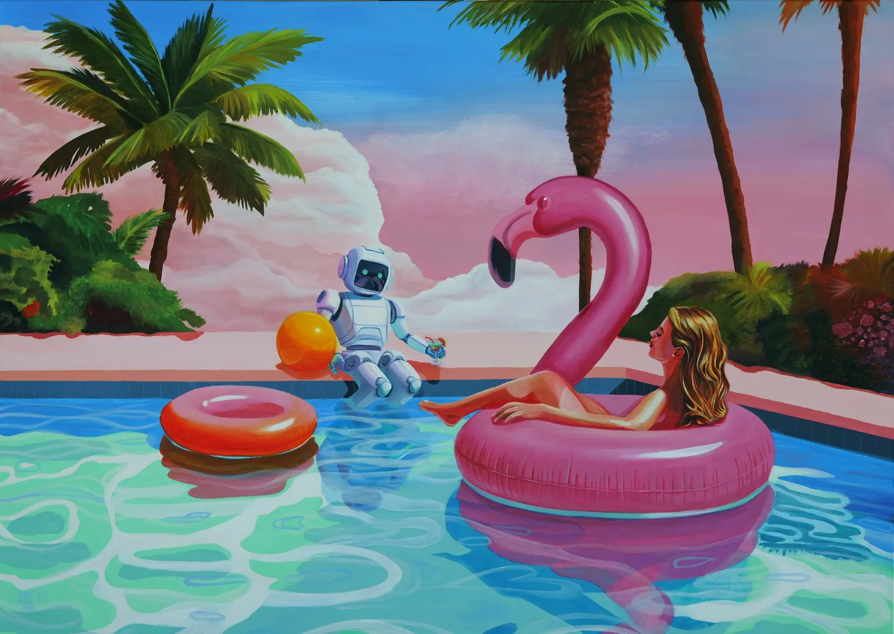 Mit „Flamingo Cocktail“ lädt Anna Breuninger in eine retro-futuristische Szenerie ein: Pastellige 80er-Jahre-Ästhetik, Miami-Vibes, Palmen, Sonne, Pool – und mittendrin ein relaxter Roboter mit Cocktail sowie ein Mensch in einem verspielt überdimensionierten, aufblasbaren Flamingo. Die Szene verkörpert eine friedliche, fast utopische Vision: Mensch und KI begegnen sich freundschaftlich, ohne Dominanz oder Dystopie. Das Werk entstand im Kontext des Ausstellungstitels „Zukunft 2.0“ – eine harmonische Zukunftsversion im Einklang von Technologie und Menschlichkeit. Die Bildidee basiert teils auf einer KI-Anregung – ein spielerischer Meta-Kommentar zur kreativen Zusammenarbeit von Mensch und Maschine.