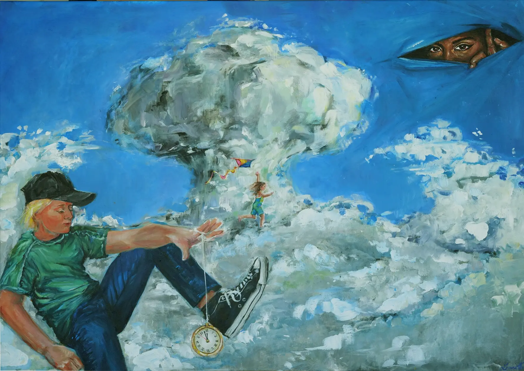 Mein Beitrag für „Kunst trifft Technik 2025“ zum Motto „Zukunft 2.0“ ist ein Appell für eine lebenswerte Zukunft, in der technischer Fortschritt verantwortungsvoll genutzt wird. In einer weiten Wolkenlandschaft, die sinnbildlich für Freiheit steht, springt ein Kind voller Lebensfreude. Es verbildlicht das Potenzial kommender Generationen. Ein zweites Kind spielt mit einem, als Uhr gestalteten Jo-Jo und erinnert somit an die Begrenztheit unserer Zeit. Hinter der heiteren Szene mahnt eine Atompilzwolke vor technologischer Hybris. Eine Frauenfigur, Sinnbild für Schöpfung und Fürsorge, durchbricht mit ihrem Blick die Bildgrenzen. Mit dem Bruch der Illusion und dem irrealen Szenario wird impliziert, dass die Zukunft noch offen und veränderbar ist. Das Werk ruft dazu auf, achtsam mit Natur, Technik und Mitmenschen umzugehen und an einer nachhaltigen Welt mitzuwirken. Mein Gemälde möchte nicht erschrecken, sondern ermutigen.