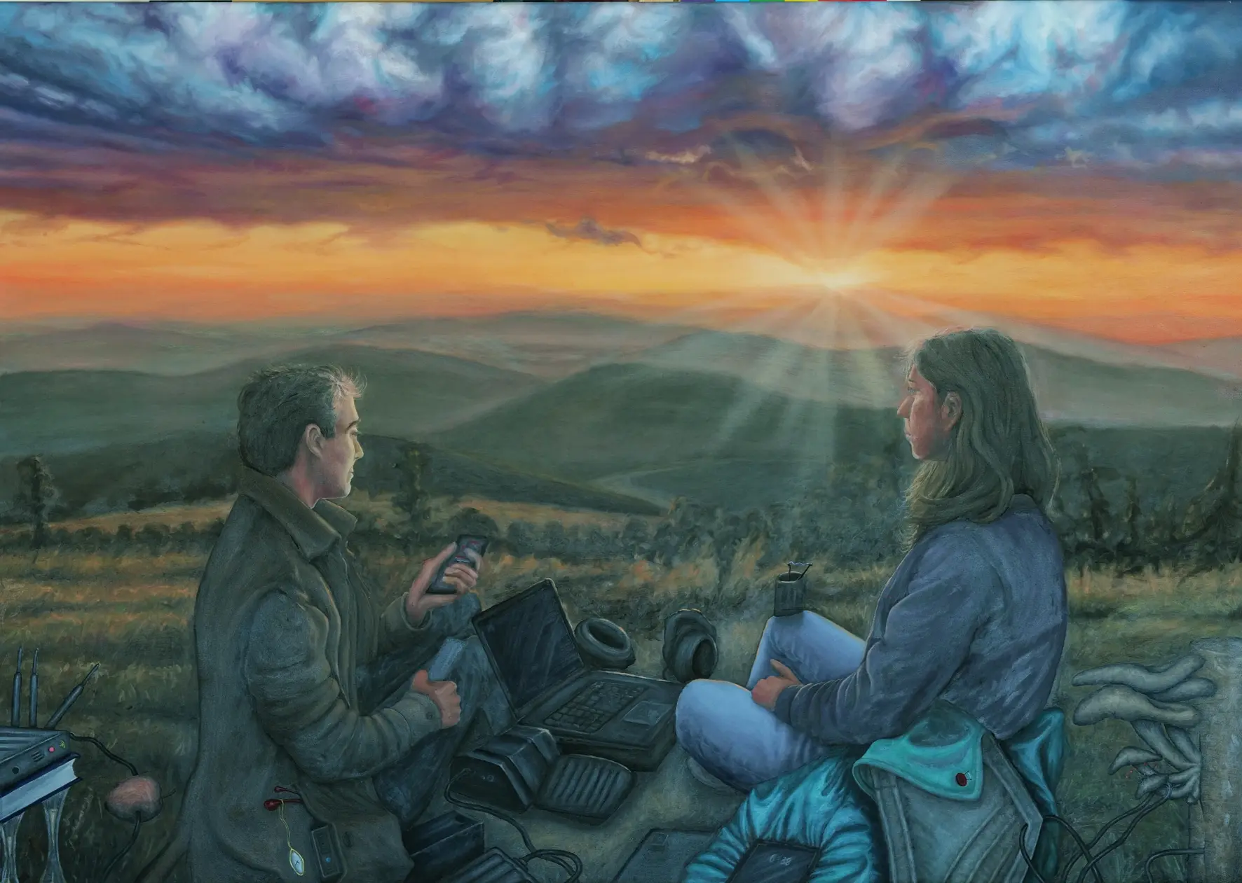 Die Atmosphäre des Gemäldes ist von einer durchgehend positiven Grundstimmung geprägt. Der Himmel leuchtet in warmen Farben und symbolisiert Hoffnung, Erneuerung und eine vielversprechende Zukunft. Die Romantik dient als Bezugsquelle, wird jedoch durch moderne Technologien überzeichnet. Das Erhabene verlagert sich vom Landschaftsbezug hin zu dem technischen Umfeld im Vordergrund. Digitale Elemente durchbrechen das klassische Motiv und setzen Techniken bewusst kontrastierend zur Romantik ein. Die Technik umgibt die Figuren als integraler Bestandteil ihres Lebens; Mensch, Technik und Umwelt treten in eine enge, symbiotische Beziehung. Die Szene strahlt Zuversicht, Fortschritt und Gemeinschaft aus und zeigt eine nachhaltige Lebenswelt, in der technologische Innovationen im Einklang mit der Natur stehen.