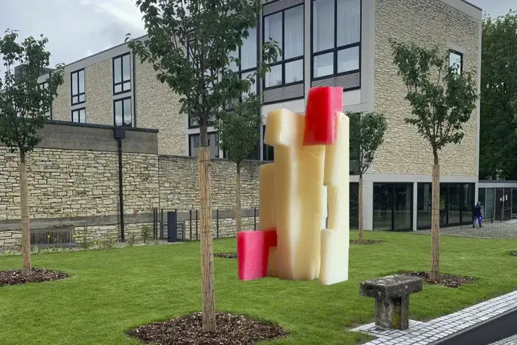 Das Modell für die Skulptur im öffentlichen Raum wurde aus Papier gestaltet und mit einem Effekt-Spray besprüht sowie digital in die Umgebung integriert.