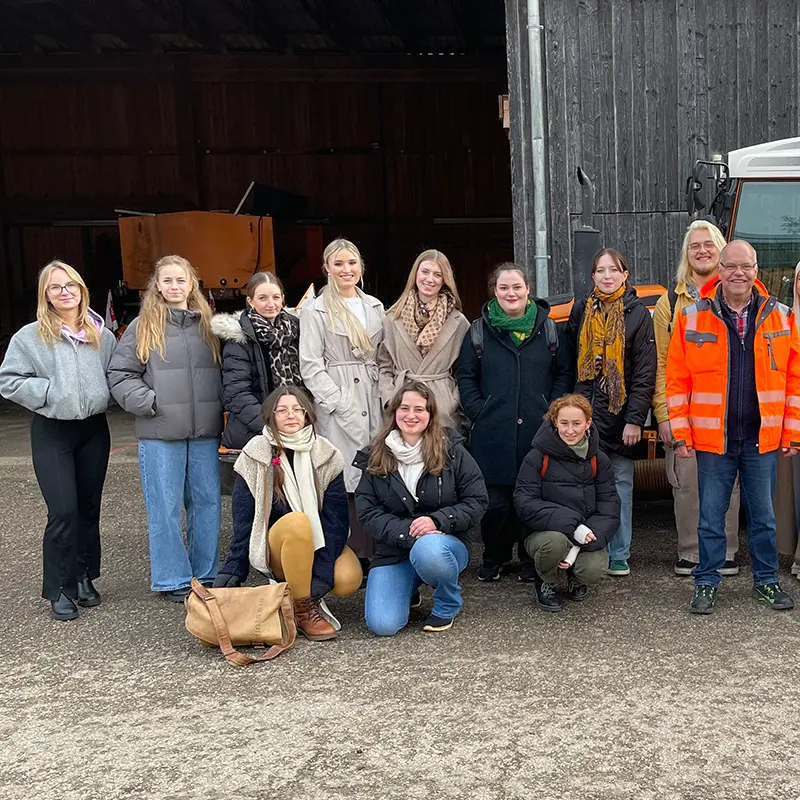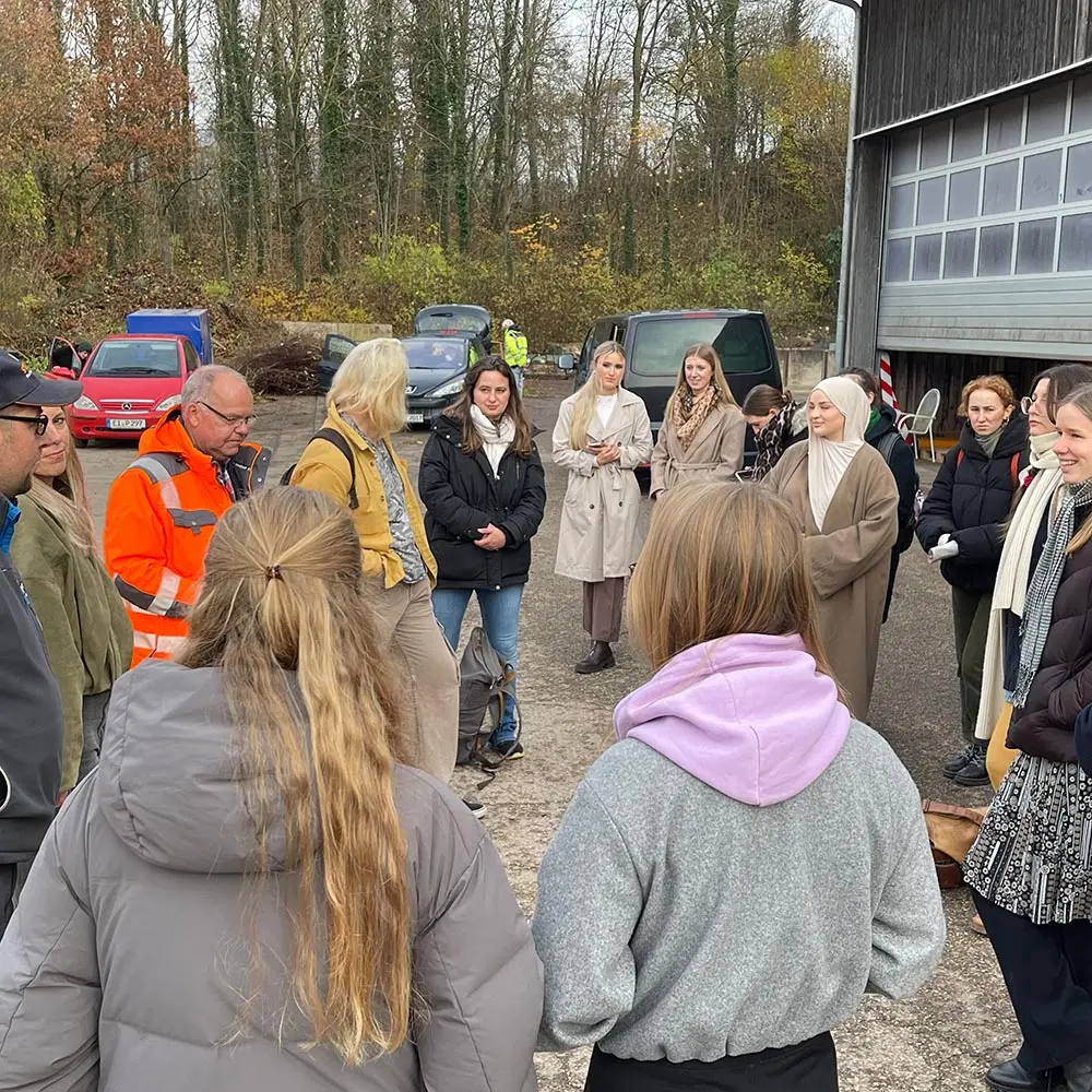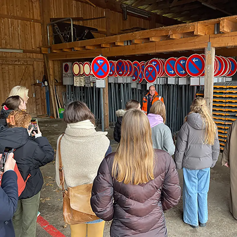 Bei einem Besuch auf dem Stadtbauhof am 12. November 2025 erhielten die Dozierenden und Studierenden der Seminare „Kuratorische Praxis - bauHÖFLICHE Grüße“ und „Malerei“ wertvolle Einblicke in die dortigen Arbeitsabläufe und Gerätschaften. In Gesprächen mit Mitarbeitenden gewannen sie zudem Einblicke in deren Arbeitsalltag sowie in Wünsche und Erwartungen an unser gemeinsames Forschungsprojekt. Der Leiter des Stadtbauhofs Herr Ablaßmeier und mehrere Mitarbeitende nahmen sich Zeit, Fragen zu beantworten und ihre vielfältigen Tätigkeiten vorzustellen.