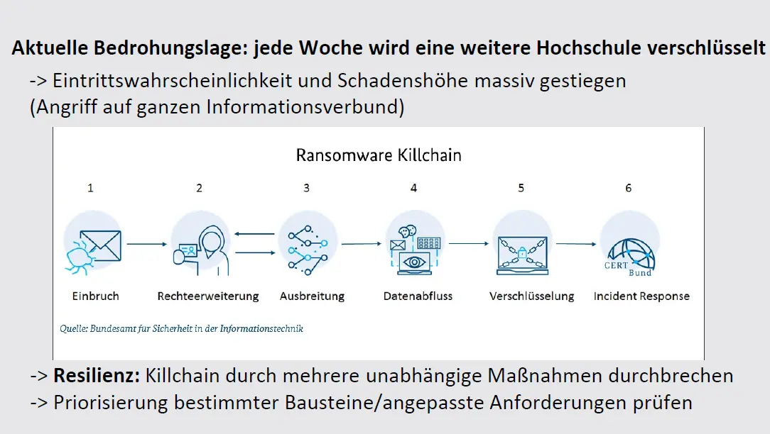 Als dann 2019 die ersten Hochschulen durch Ransomware in Gänze verschlüsselt wurden, war klar, dass wir auch unsere technischen und organisatorischen Verteidigungsmaßnahmen weiter verbessern müssen. Wir begannen mit freiwilligen Schulungsangeboten (Awareness für Mitarbeitende). Die Stabsstelle IT-Sicherheit begann außerdem über die Pressestelle bei besonders gefährlichen Phishing-Wellen erklärende Warnmails zu versenden, um unbekannte KU-Opfer bei vertrauensvoller Diskretion dringend zur Meldung zu ermutigen, wodurch wir die interne Weiterverbreitung von Schadmails meist verhindern konnten und gleichzeitig ein gutes Vertrauensverhältnis zu unseren Kollegen und Studierenden aufbauen konnten.