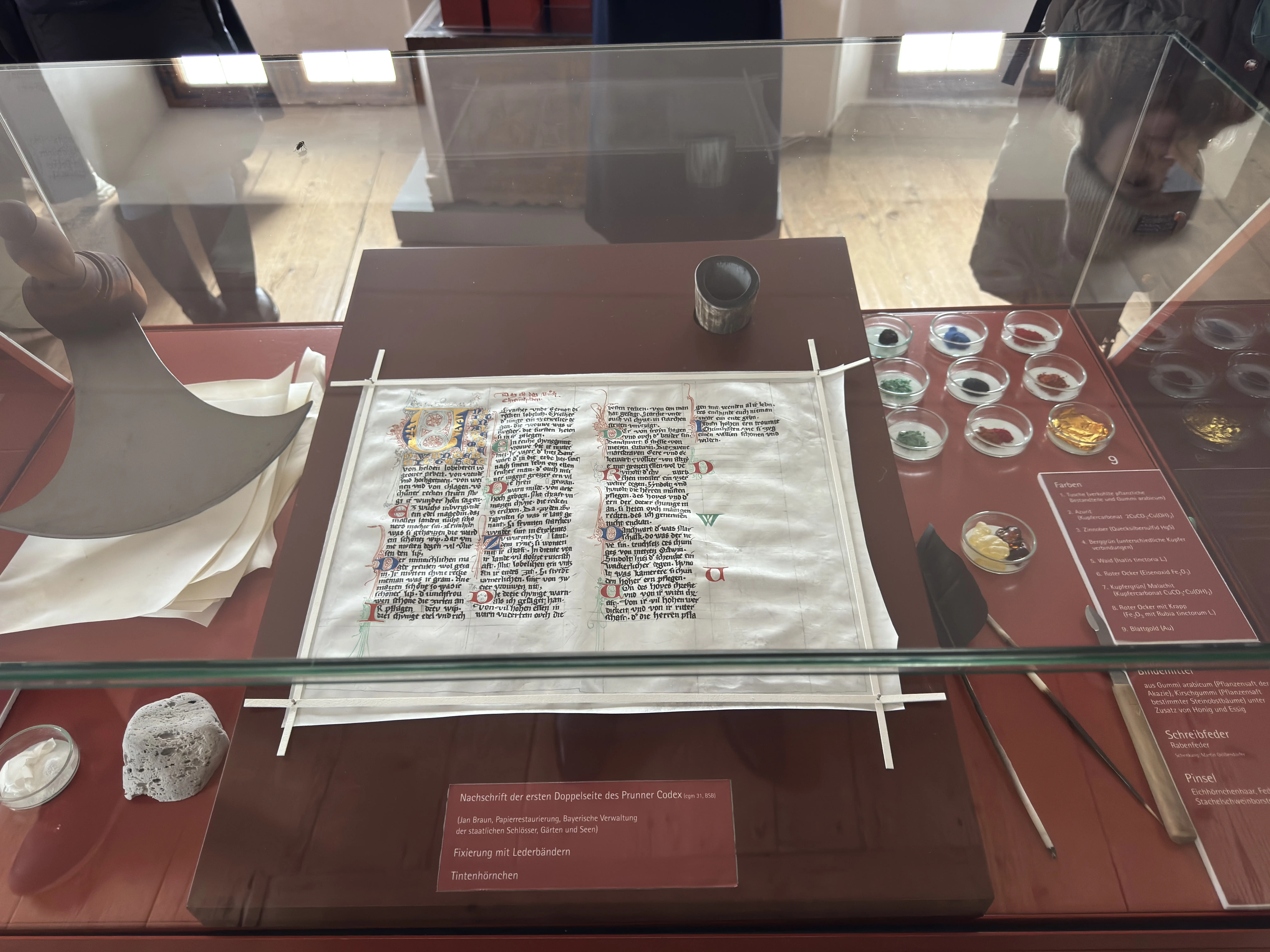 Das Adelsgeschlecht der Fraunberger starb – nomen est omen – mangels männlicher Erbfolger 1566 aus. Nach dem Tod des letzten Grafen machte Wiguläus Hund, Geschichtsschreiber und Hofrat Herzog Albrechts V., eine wortwörtlich sagenhafte Entdeckung bei einem Besuch der Burg: Er stieß auf den "Prunner Codex", eine vollständige Handschrift des Nibelungenliedes, des berühmtesten mittelhochdeutschen Heldenepos. Die sogenannte „Handschrift D“ reiht sich ein in die Liste von (bis heute) elf vollständig überlieferte Handschriften. Die prächtig vergoldeten Initialen verleihen ihr noch immer Extravaganz und deuten auf mutmaßlich adelige Auftraggeber hin. Mittlerweile befindet sich das Original in der Bayerischen Staatsbibliothek in München. Die Exkursionsgruppe durfte aber eine detailgetreue Nachbildung bestaunen.