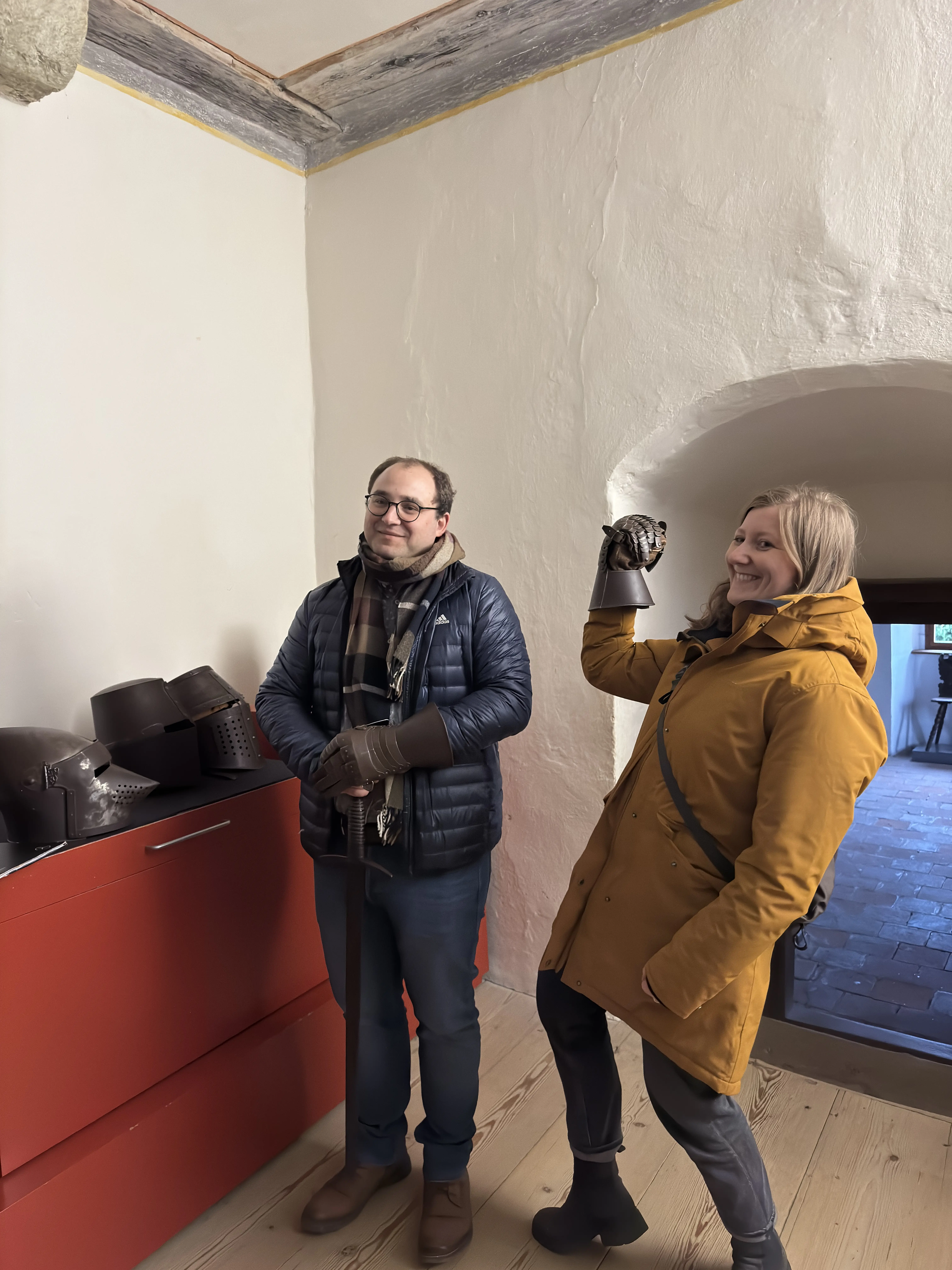 Ein weiteres Highlight der Führung war die Anprobe einer originalgetreu nachgebildeten Ritterrüstung. Besonders spannend war der Panzerhandschuh: Trotz des massiven Aussehens ließ er sich erstaunlich gut bewegen. Gerade diese Kombination aus Schutz und Flexibilität zeigte, wie klug und effizient die Rüstungen bereits gebaut wurden.