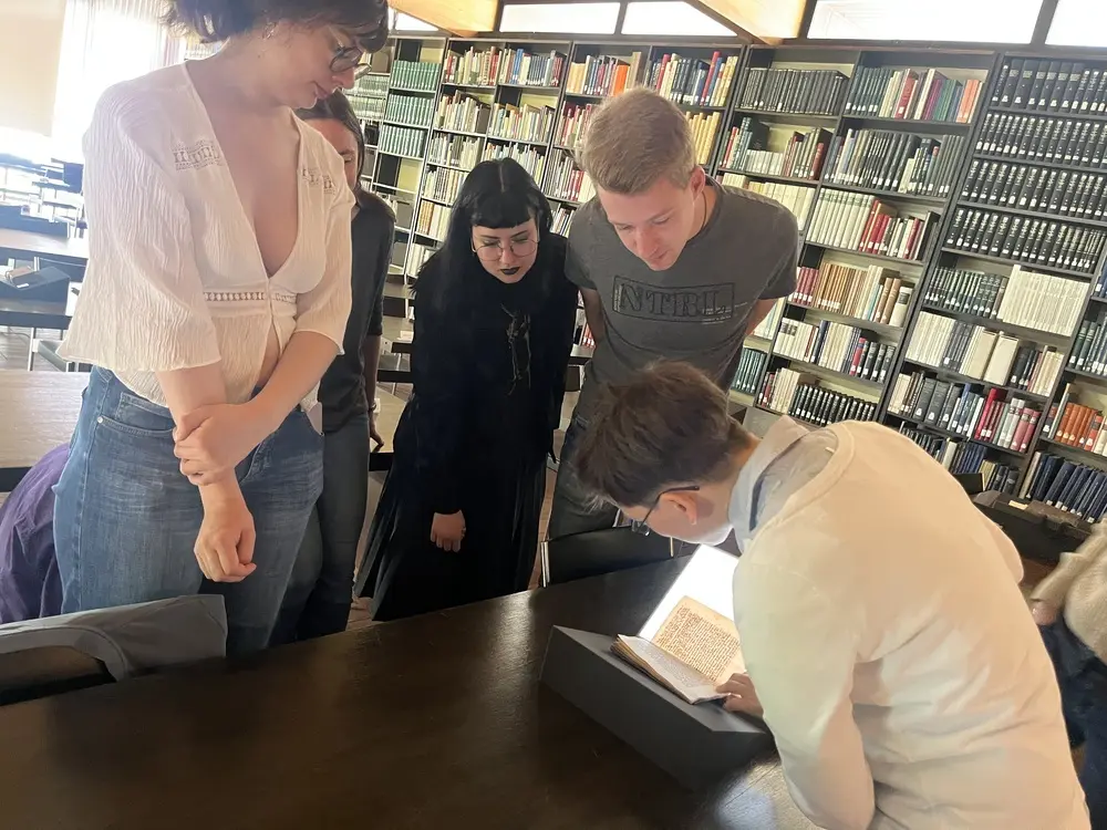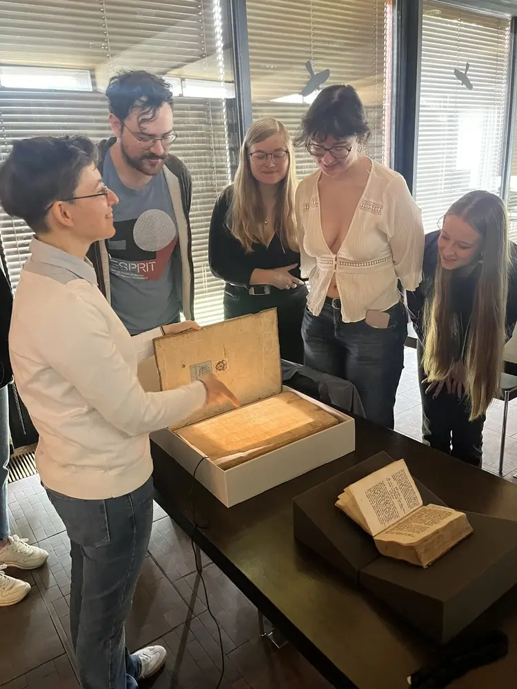 Mit mittelalterlichen Handschriften, ihren Eigenheiten, aber auch Herausforderungen beschäftigten sich Studierende der KU in diesem Sommersemester im Rahmen der von Prof. Dr. Caroline Emmelius vom Lehrstuhl für ältere Deutsche Literaturwissenschaft geleiteten Lehrveranstaltung „Einführung in die mittelalterliche Textüberlieferung: Handschriften, frühe Drucke, Flugpublizistik“. Passend dazu besuchte Katrin Sturm vom Handschriftenzentrum Leipzig am 22. Mai 2025 das Seminar, um die Studierenden an ihrem umfassenden Knowhow zur Handschriftenerschließung teilhaben zu lassen.