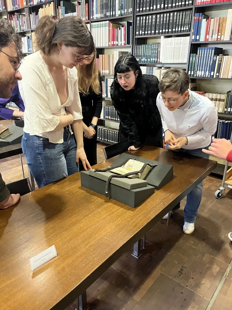 Bei Pergamenthandschriften finden sich zwar keine solchen Wasserzeichen, aber dafür stießen die Studierenden in der unbekannten Pergamenthandschrift auf sehr aufwendig gestalteten Buchschmuck. Was genau es damit auf sich hatte, blieb der Zeitgründe wegen leider noch ungeklärt, aber Katrin Sturm erläuterte, dass dafür interdisziplinäre Expertise gefragt sei. Dies weckt also auch nur weiterhin das Interesse daran, durch Handschriften der Vergangenheit nachzugehen.