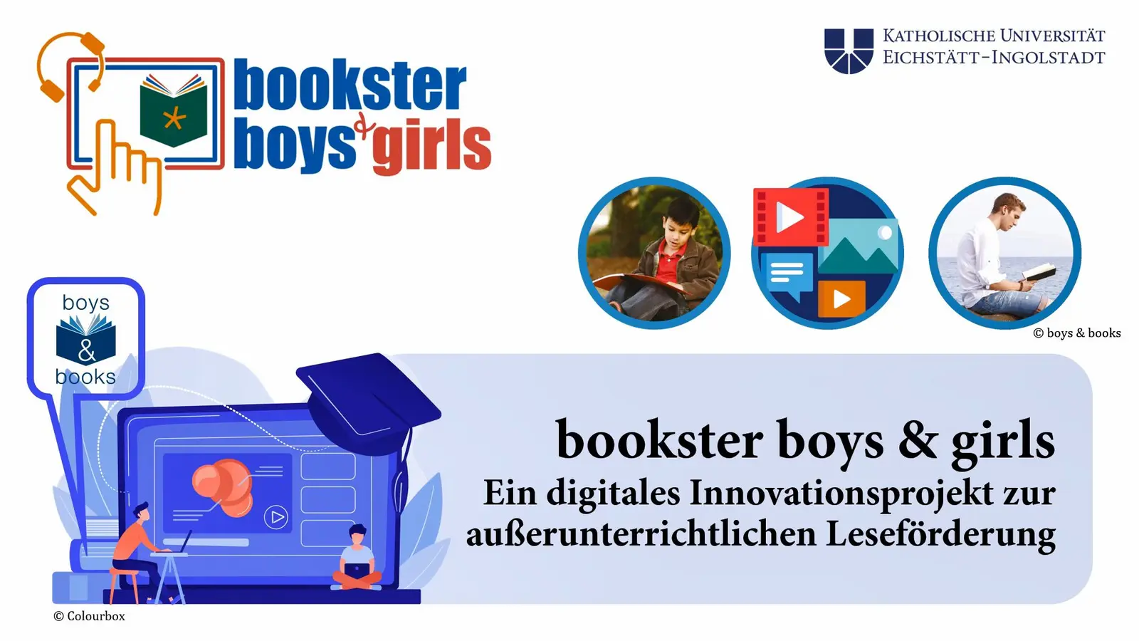 Das im Rahmen des Innovationsfonds 'KU in Bewegung' aus Mitteln des Bund-Länder-Programms „Innovative Hochschule“ (BMBF) geförderte Peergruppenprojekt bookster boys & girls versteht sich als Mitmach-Angebot zur Leseförderung von Jungen und Mädchen und verfolgt das Leitziel, (bildungsbenachteiligte) Schüler*innen zum Lesen zu animieren. Wissenschaftlichen Anschluss findet das Transferprojekt an die Leseforschung, u. a. von Christine Garbe, sowie das von Garbe 2012 gegründete und seit 2018 am Eichstätter Lehrstuhl für Didaktik der deutschen Sprache und Literatur etablierte Leseförderprojekt boys & books - Empfehlungen zur Leseförderung (nicht nur) von Jungen.