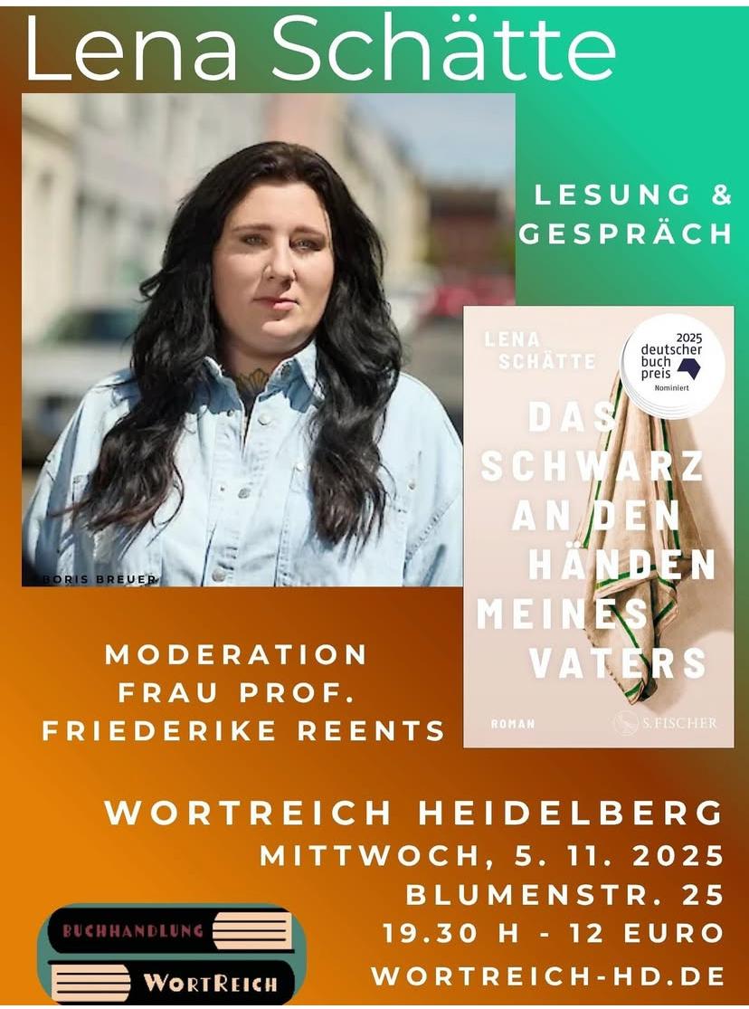 Friederike Reents (Moderation): 5.11.2025, 19.30 Uhr: “Das Schwarz an den Händen meines Vaters. Lesung und Gespräch mit Lena Schätte" (Buchhandlung Wortreich, Heidelberg).
