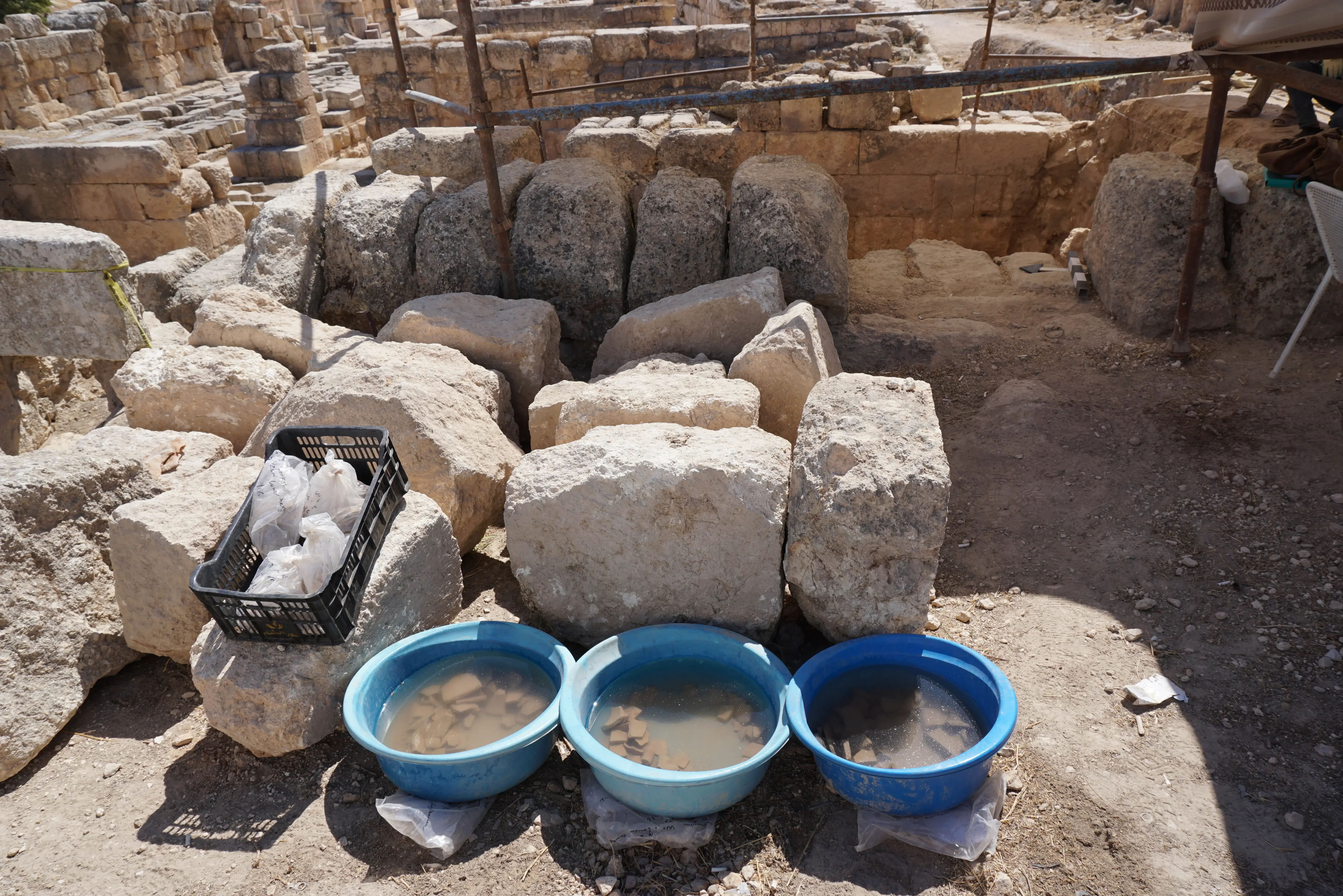 Gerhard Zimmer und Wolfgang Thiel trafen in Jordanien ein und stießen zum Grabungsteam. Gleichzeitig erreichte uns die erfreuliche Nachricht, dass wir die umayyadische Mauer nun abbauen durften. Zuvor machte die Architektin Safa‘ Judeh für uns structure-for-motion Aufnahmen, so dass wir ein 3D-Modell des umayyadischen Raums zur Verfügung haben. Die darunterliegende byzantinische Mauer lief, wie vermutet, quer durch die porticus. In ihrer Mitte war noch deutlich die Türschwelle zu erkennen. Auch von ihr wurden 3D-Aufnahmen angefertigt.