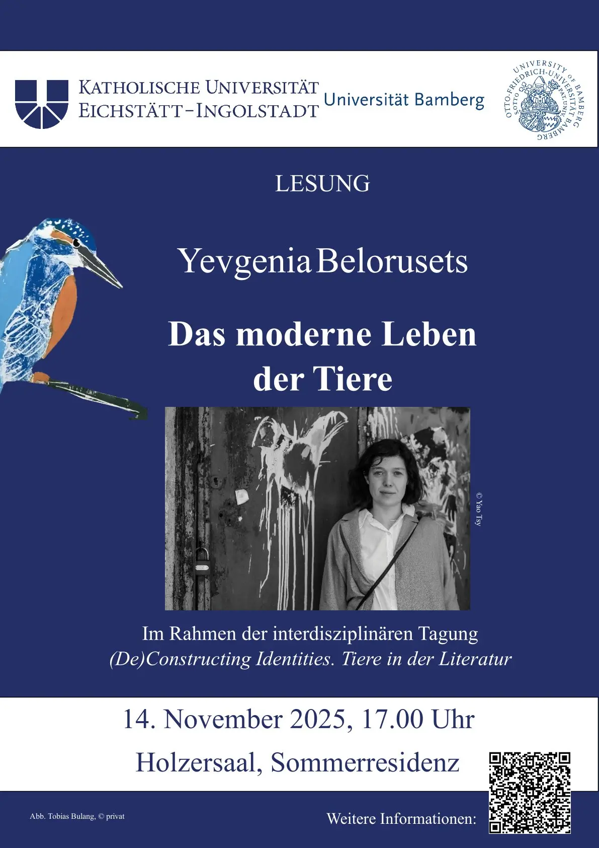 Belorusets wird aus ihrem Band Über das moderne Leben der Tiere (2024) lesen, einem Werk, das auf feinsinnige Weise Humor und präzise Beobachtung verbindet. In scheinbar sachlichen Vorträgen und Erzählstücken werden Begebenheiten geschildert, die von Menschen und Tieren erzählen; Begebenheiten, in denen die Grenze zwischen menschlichen und tierlichen Identitäten oft unscharf bleiben, die von Verlust und Krieg, von Begreifen und Loslassen handeln. Diese poetisch-dokumentarisch anmutende Prosa wirft einen stillen und eindringlichen Blick auf das vielfältige Zusammenspiel von Mensch und Tier in einer von Unsicherheit geprägten Gegenwart.