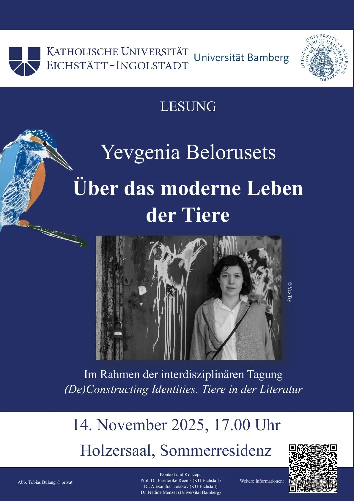Belorusets wird aus ihrem Band Über das moderne Leben der Tiere (2024) lesen, einem Werk, das auf feinsinnige Weise Humor und präzise Beobachtung verbindet. In scheinbar sachlichen Vorträgen und Erzählstücken werden Begebenheiten geschildert, die von Menschen und Tieren erzählen; Begebenheiten, in denen die Grenze zwischen menschlichen und tierlichen Identitäten oft unscharf bleiben, die von Verlust und Krieg, von Begreifen und Loslassen handeln. Diese poetisch-dokumentarisch anmutende Prosa wirft einen stillen und eindringlichen Blick auf das vielfältige Zusammenspiel von Mensch und Tier in einer von Unsicherheit geprägten Gegenwart.