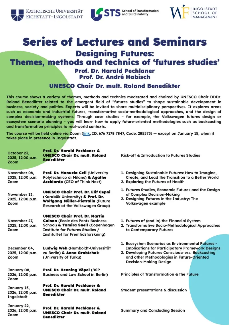 Das Seminar zeigt, wie Zukunftsbilder entstehen, die Erwartungen formen und Orientierung für Transformation und Nachhaltigkeit bieten. Anhand von Fallstudien – etwa zur Zukunftsgestaltung bei Volkswagen oder zur Szenarioplanung von Ökosystemen – lernen die Studierenden, wie sich zukunftsorientierte Methoden wie Backcasting oder Transformationsprinzipien praktisch anwenden lassen.