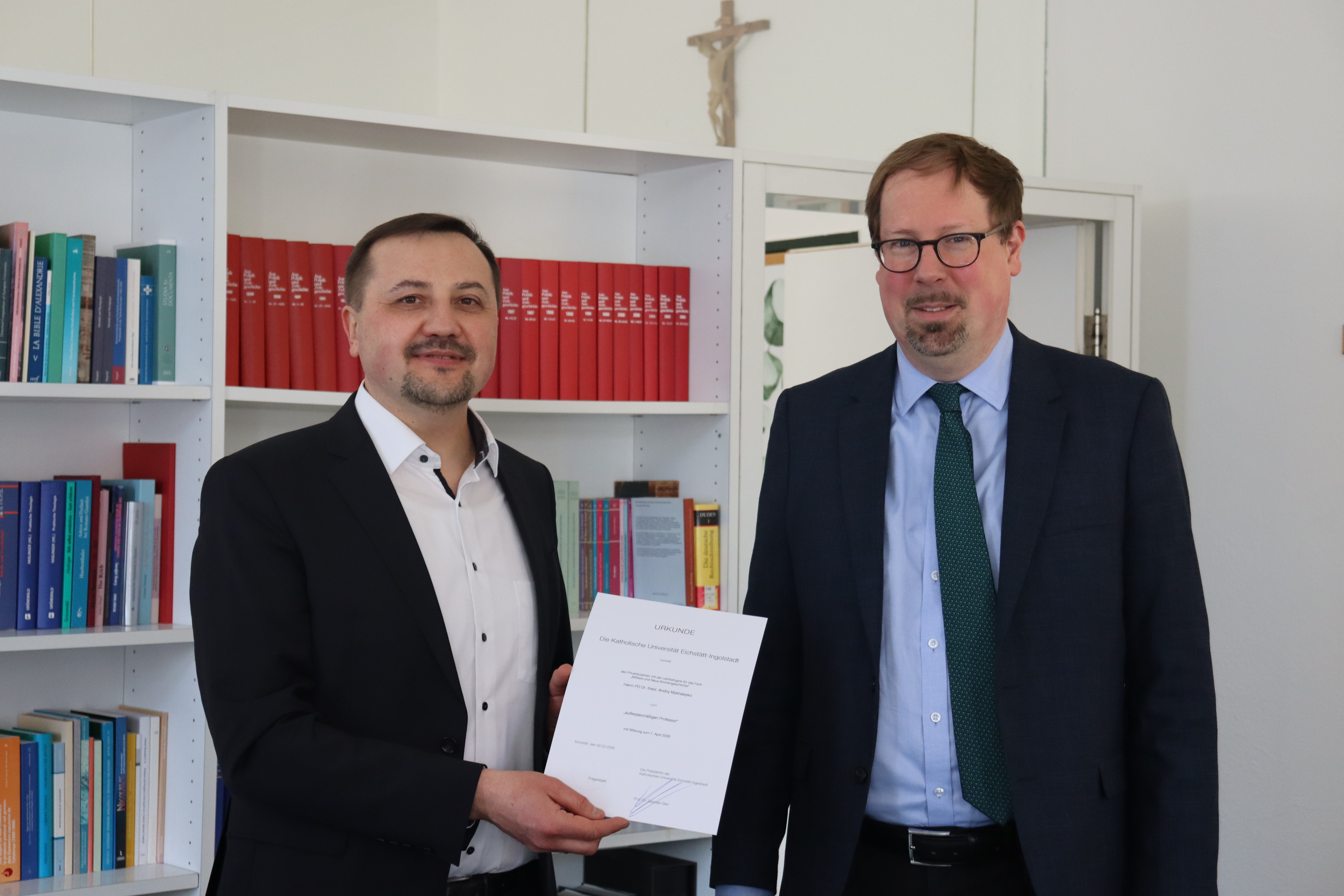 Die Katholische Universität Eichstätt-Ingolstadt hat die Verdienste von Andriy Mykhaleyko nun mit der Ernennung zum außerplanmäßigen Professor an der Theologischen Fakultät honoriert. Am 20. März 2026 konnte Prodekan Prof. Dr. Bernward Schmidt im Rahmen einer kleinen Feier die Ernennungsukrunde überreichen.