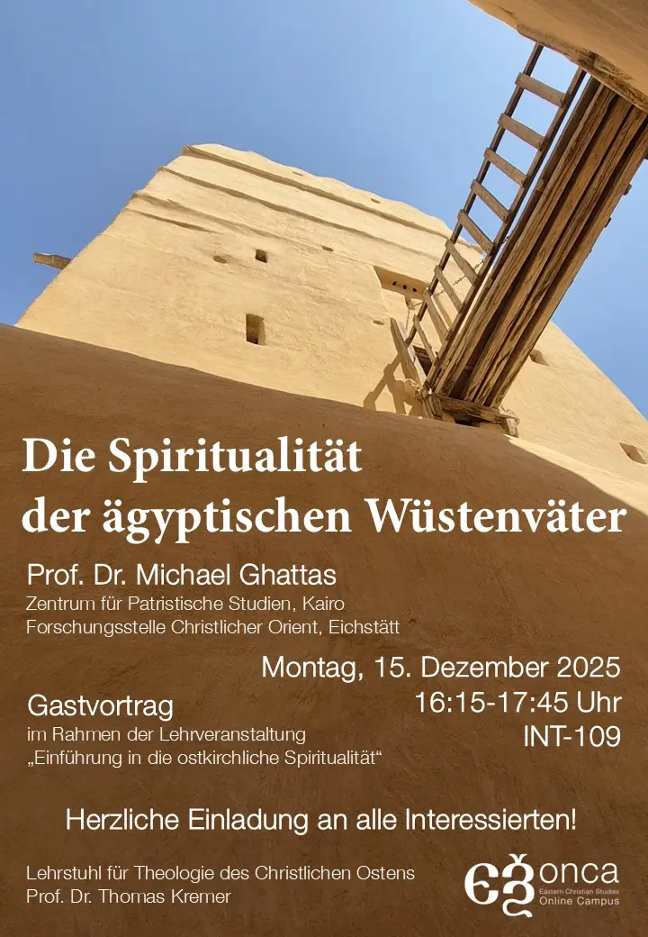 Am Montag, 15. Dezember 2025, findet ab 16.15 Uhr Uhr im Raum INT-109 ein Gastvortrag von Prof. Dr. Michael Ghattas (Zentrum für Patristische Studien, Kairo) mit dem Titel “Die Spiritualität der ägyptischen Wüstenväter” im Rahmen der Lehrveranstaltung “Einführung in die ostkirchliche Spiritualität” statt. Michael Ghattas ist Mitglied der Forschungsstelle Christlicher Orient der KU Eichstätt-Ingolstadt. Es ergeht herzliche Einladung an alle Interessierten!