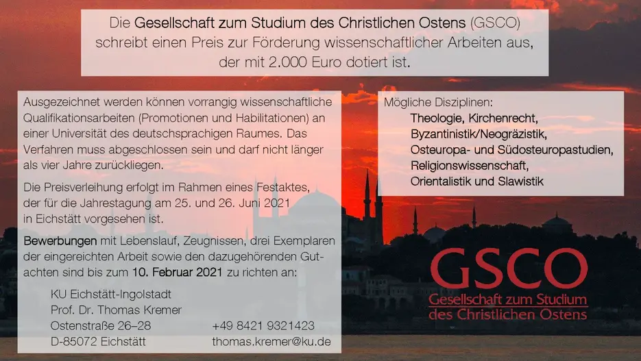 Die „Gesellschaft zum Studium des Christlichen Ostens“ (GSCO) hat einen Preis zur Förderung wissenschaftlicher Arbeiten gestiftet, die dem Studium des Christlichen Ostens gewidmet sind und die wissenschaftlichen Kenntnisse über die Geschichte und Theologie des Christlichen Ostens wesentlich befördern. Bewerbungen für den GSCO-Preis 2021 können bis zum 10. Februar 2021 an der Eichstätter Stiftungsprofessur für Theologie des Christlichen Ostens eingereicht werden.