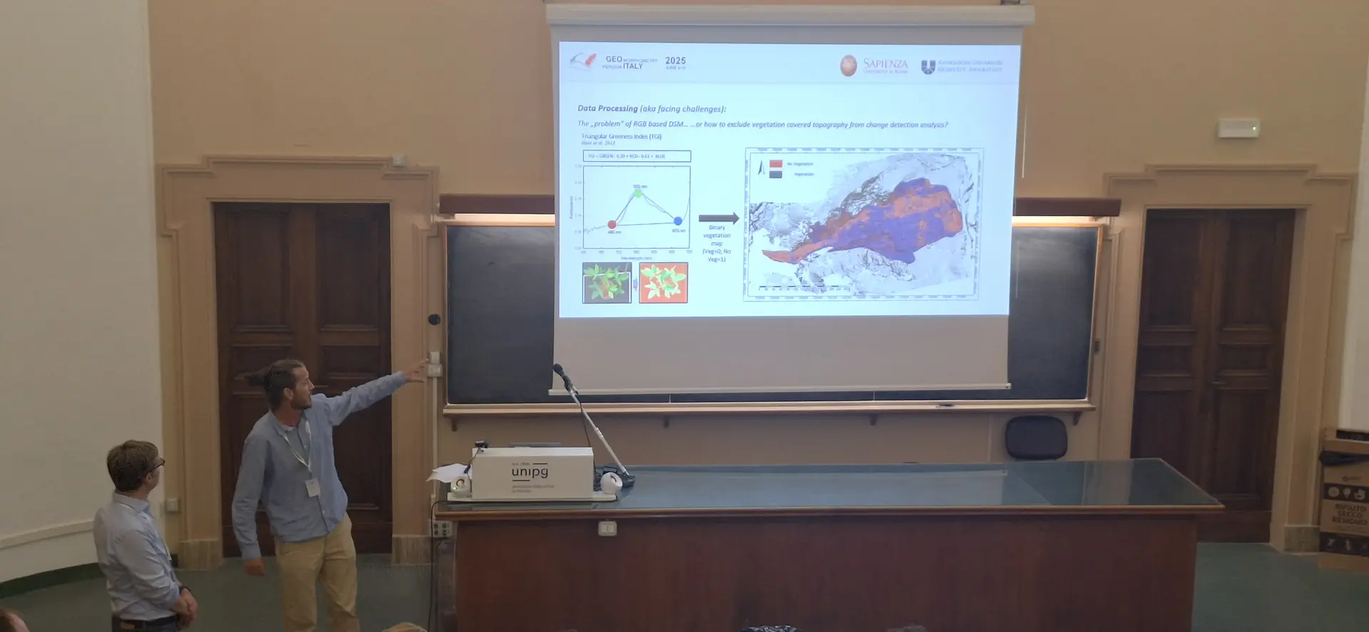 Im Modul “Digitale Reliefanalyse” werden digitale Geländemodelle (DGM) analysiert. Dabei werden nicht nur Visualisierungsübungen gemacht (z.B. eine virtuelle Schummerung oder das Drapieren von Luftbildern über das DGM), sondern auch Reliefparameter berechnet und in Kartenform dargestellt. Die Bedeutung einfacher Parameter wie der Hangneigung oder -exposition können sich auch AnfängerInnen relativ leicht vorstellen, es gibt jedoch auch komplexere Parameter wie z.B. die Einzugsgebietsgröße (flow accumulation) oder den Wetness Index. Im Sommersemester 2025 haben wir erstmals versucht, die Visualisierung und damit das Verständnis der komplexeren Reliefparameter dadurch zu verbessern, dass die Studierenden sich einer VR-Umgebung virtuell über ein digitales Geländemodell bewegen können. Historische und aktuelle Luftbilder, die über das Geländemodell gelegt werden, geben dann einen realistischen Eindruck von der Landschaft in der Gegenwart und Vergangenheit. Auch komplexe Parameter können dargestellt werden, sodass sich die Studierenden besser vorstellen können, wie sich hohe/niedrige Werte der Parameter im Gelände verteilen und so den jeweiligen Parameter besser verstehen.