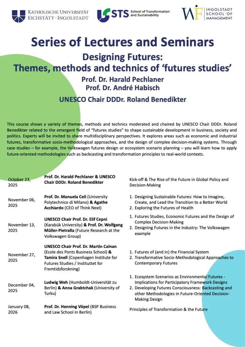 Die Lehrveranstaltung „Designing Futures: Themes, Methods and Techniques of Futures Studies“ widmet sich den vielfältigen Themen, Methoden und Techniken der Zukunftsforschung.Unter der Leitung von UNESCO Chair DDDr. Roland Benedikter werden unterschiedliche Perspektiven zusammengeführt, um nachhaltige Entwicklungen in Wirtschaft, Gesellschaft und Politik zu gestalten. Eingeladene Experten teilen dabei ihre inter- und transdisziplinären Ansätze und eröffnen neue Sichtweisen auf mögliche Zukünfte.