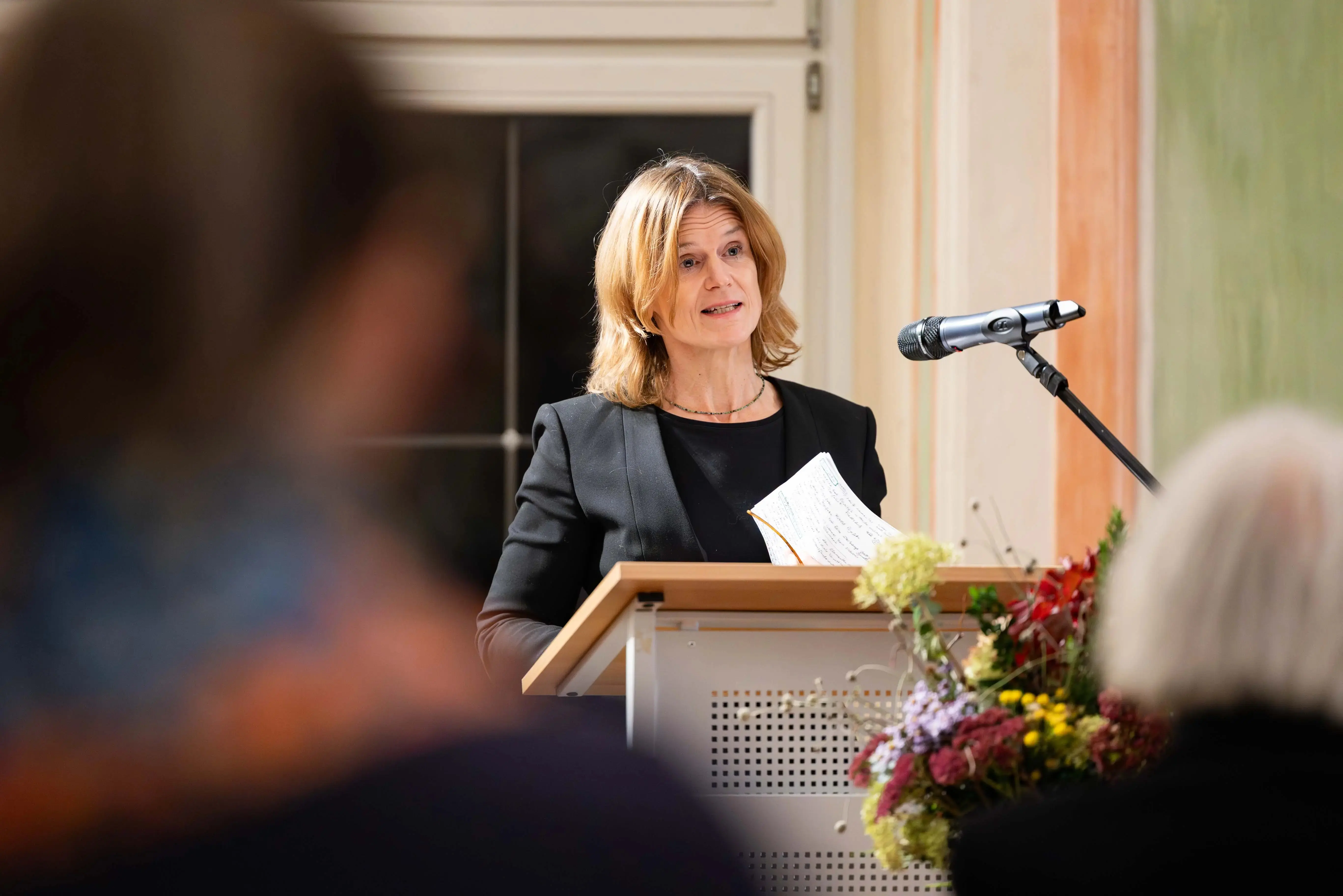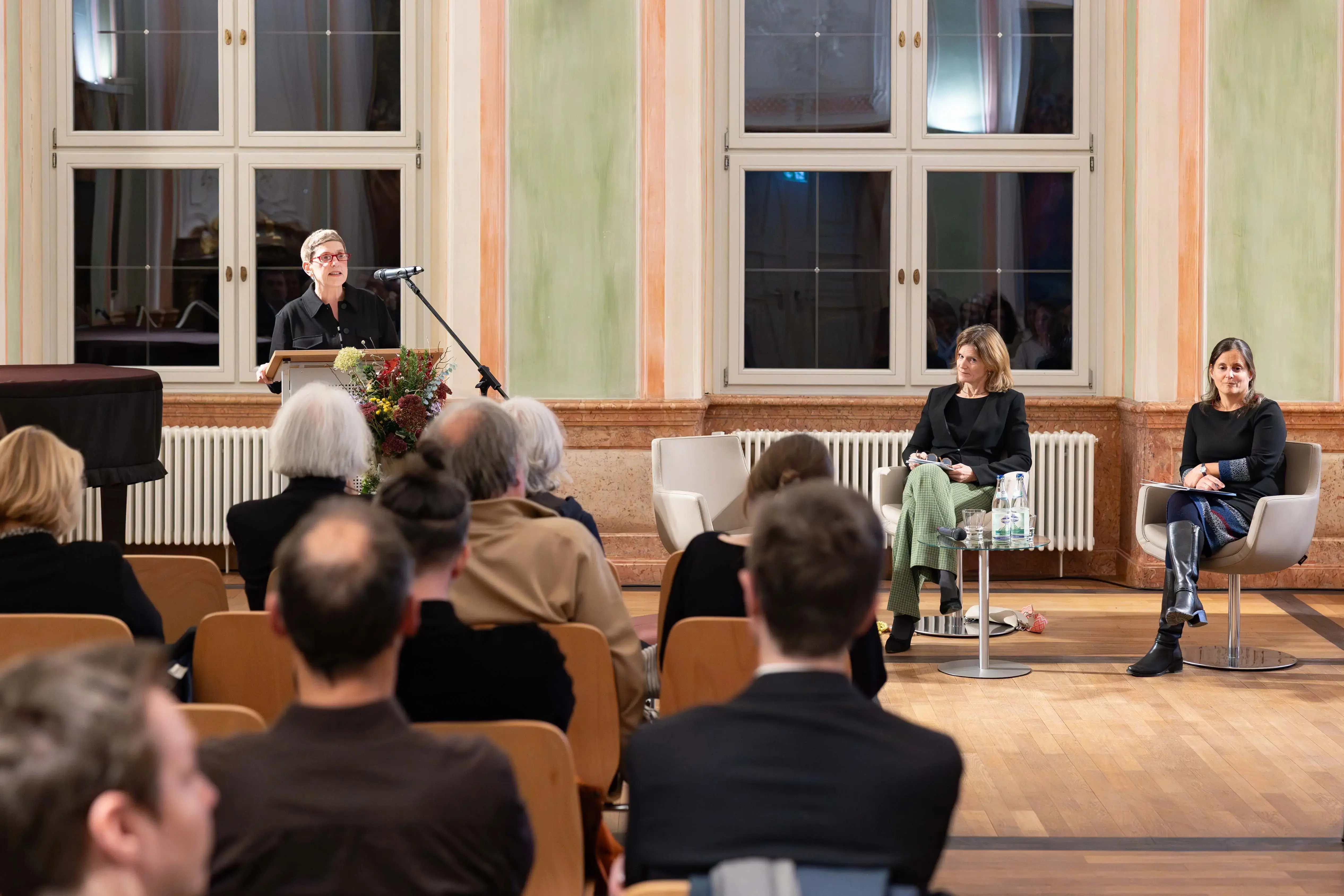 Zahlreiche Literaturinteressierte wollten Felicitas Hoppe auf den Spuren des Vertrauens in ihrem Werk folgen und waren der Einladung der Professorin für Pastoraltheologie Katharina Karl und Literaturwissenschaftsprofessorin Friederike Reents in den Holzersaal gefolgt. Unter dem Titel „Pfeifen im Wald? Unterwegs zwischen Zweifel und Vertrauen.“ offenbarte die Büchner-Preisträgerin Felicitas Hoppe das große Spektrum des Vertrauensbegriffs in ihrem Werk: Hier finden sich Variationen des Vertrauens, des Vertrauten, des Sich-Anvertrauens oder des Verlassens von vertrautem Terrain.