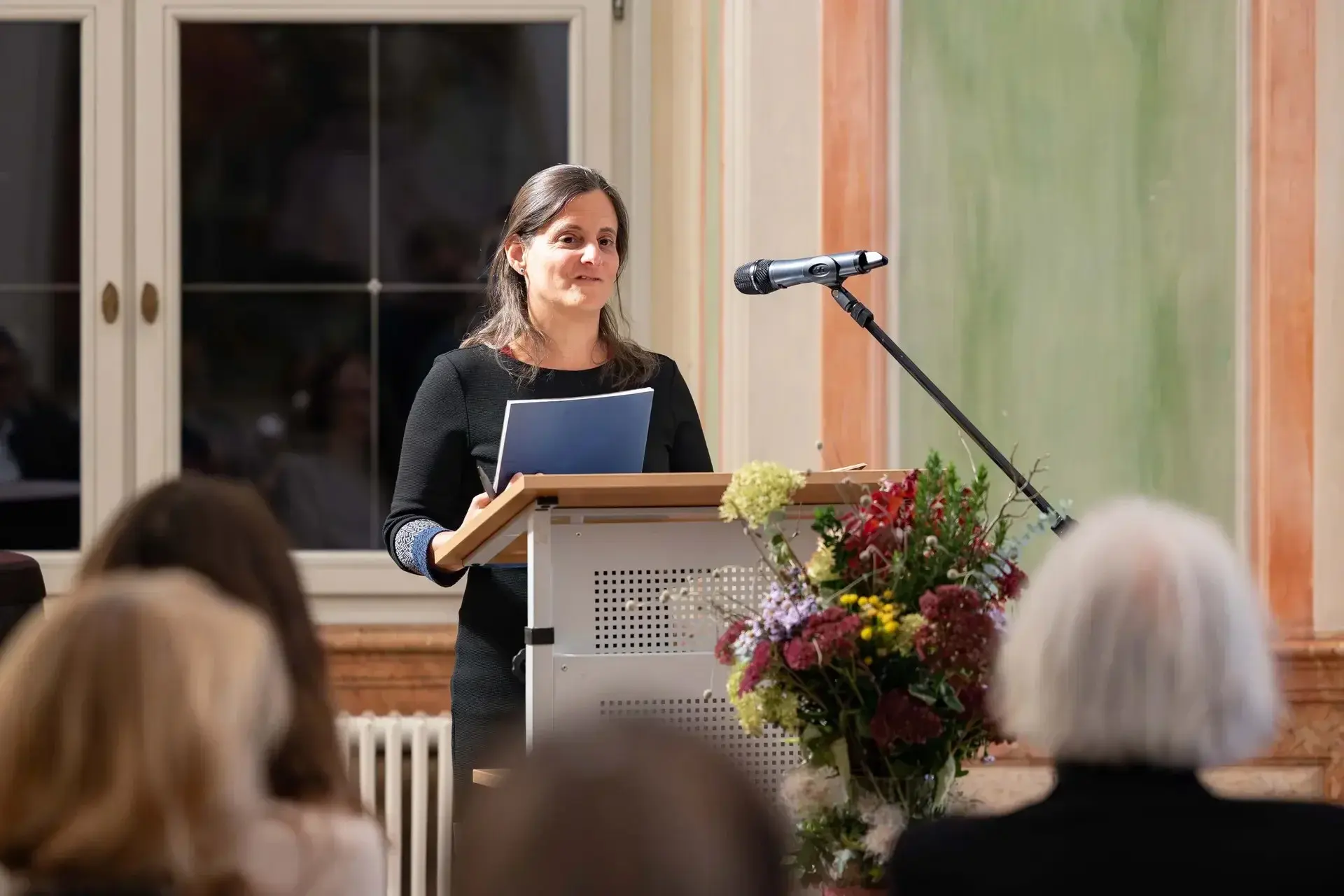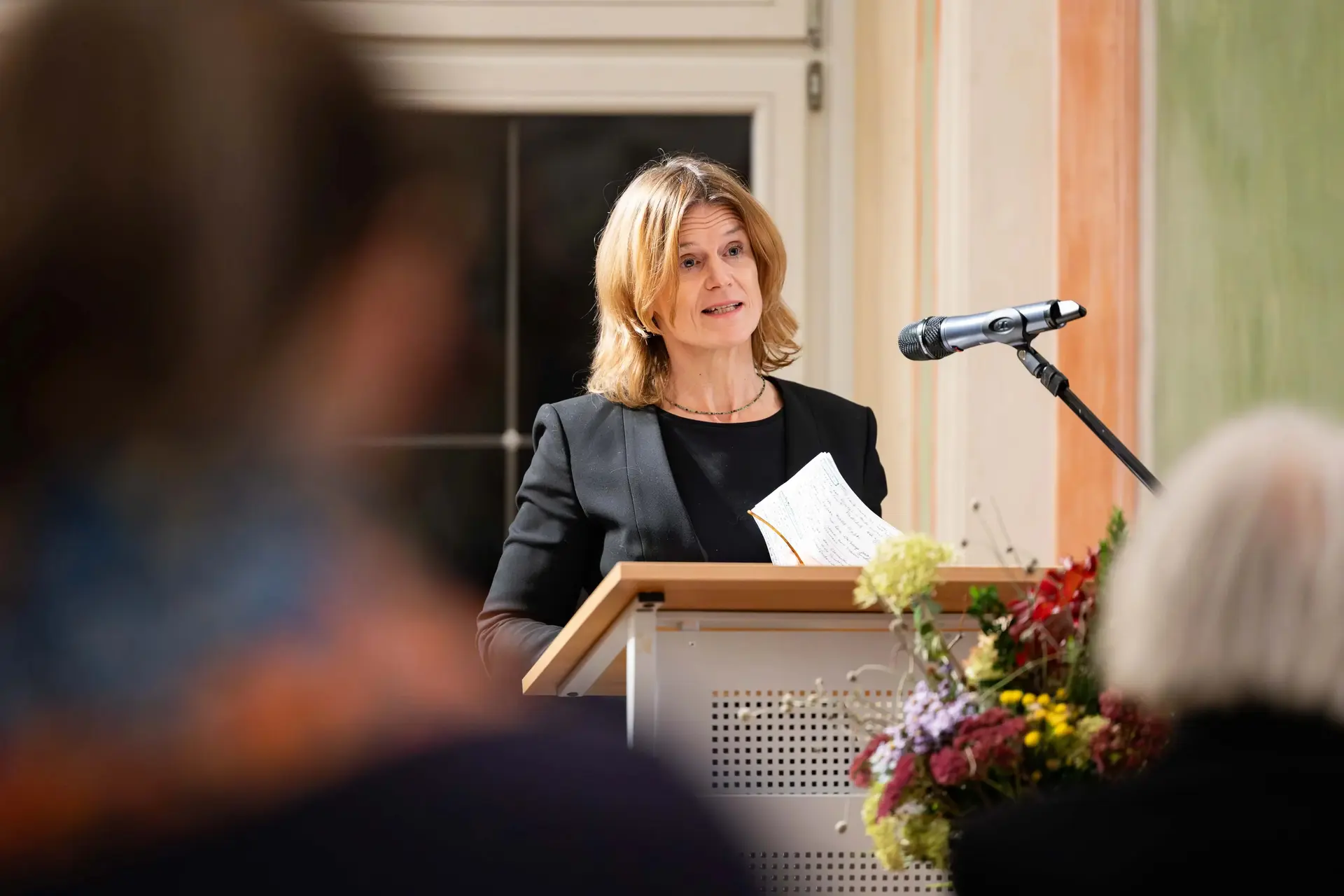 Zahlreiche Literaturinteressierte wollten Felicitas Hoppe auf den Spuren des Vertrauens in ihrem Werk folgen und waren der Einladung der Professorin für Pastoraltheologie Katharina Karl und Literaturwissenschaftsprofessorin Friederike Reents in den Holzersaal gefolgt. Unter dem Titel „Pfeifen im Wald? Unterwegs zwischen Zweifel und Vertrauen.“ offenbarte die Büchner-Preisträgerin Felicitas Hoppe das große Spektrum des Vertrauensbegriffs in ihrem Werk: Hier finden sich Variationen des Vertrauens, des Vertrauten, des Sich-Anvertrauens oder des Verlassens von vertrautem Terrain.