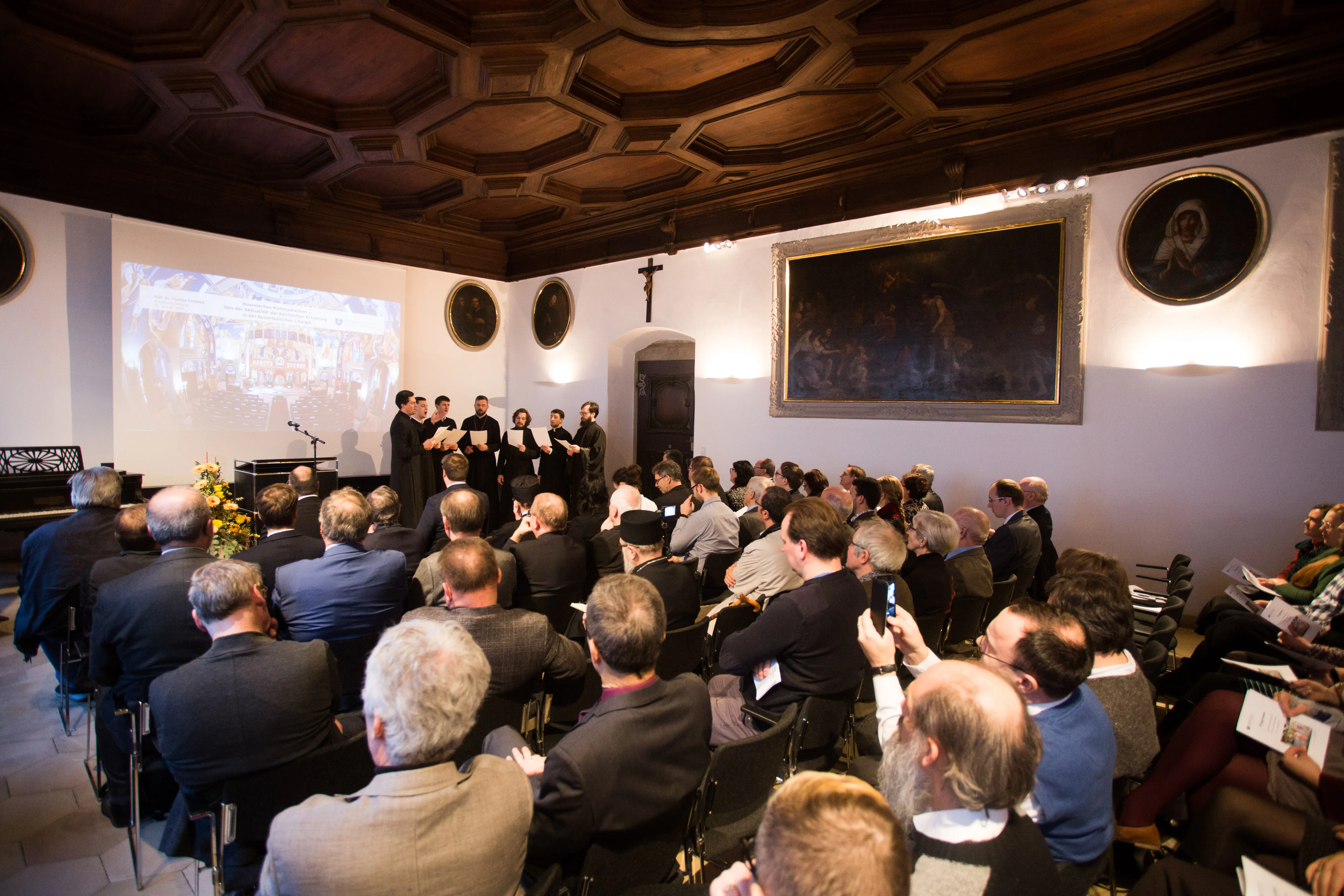 In seinem Vortrag erschloss Prof. Kremer die byzantinische Liturgie anhand dreier großer hermeneutischer Schlüssellinien: Zum einen nehme die byzantinische Liturgie biblisch-historische Motivik auf und transformiere diese in eine für die Liturgie geeignete kultische Sprache. Zum anderen überschreite die byzantinische Liturgie in ihrer liturgischen Symbolsprache ihre historischen Bezüge zum Leben Jesu und lege ihre Symbolik mit Blick auf den ganzen Kosmos aus. Zum Schluss schlug Prof. Kremer eine Brücke zur Gegenwart und legte dar, inwiefern die byzantinische Liturgie den Feiernden eine ganzheitliche Erfahrung des Glaubens ermögliche.
