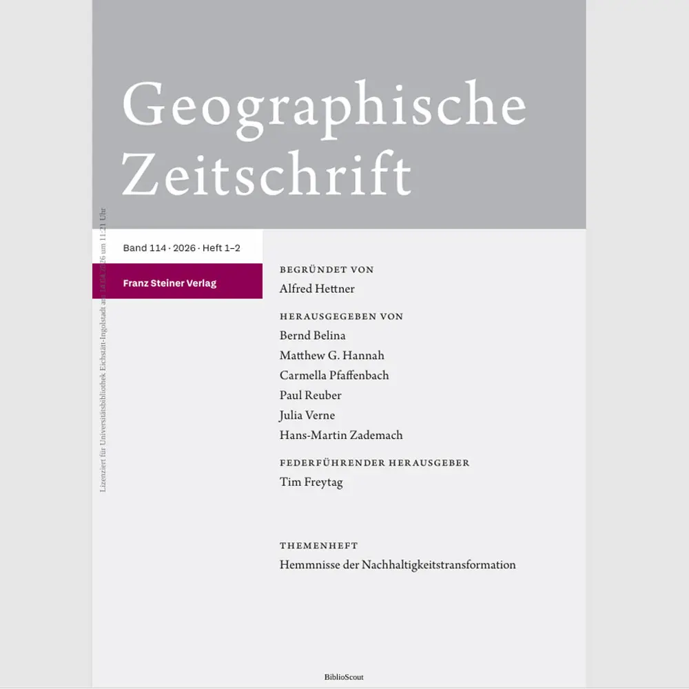 Fromhold-Eisebith, M. & H.-M. Zademach (Hrsg.) (2026): Hemmnisse der Nachhaltigkeitstransformation, Themenheft der Geographischen Zeitschrift, 114. Jahrgang, Heft 1-2: Das Themenheft befördert über ausgewählte raumwissenschaftliche Zugänge sowohl konzeptionell als auch methodologisch ein vertieftes Verständnis der individuellen und kollektiven sowie materiellen und immateriellen Hürden, Barrieren und Widerstände, die einen fundamentalen Wandel des Verhaltens wirtschaftlicher bzw. gesellschaftlicher Akteure hin zu nachhaltigeren Praktiken erschweren bzw. ihm zuwiderlaufen.