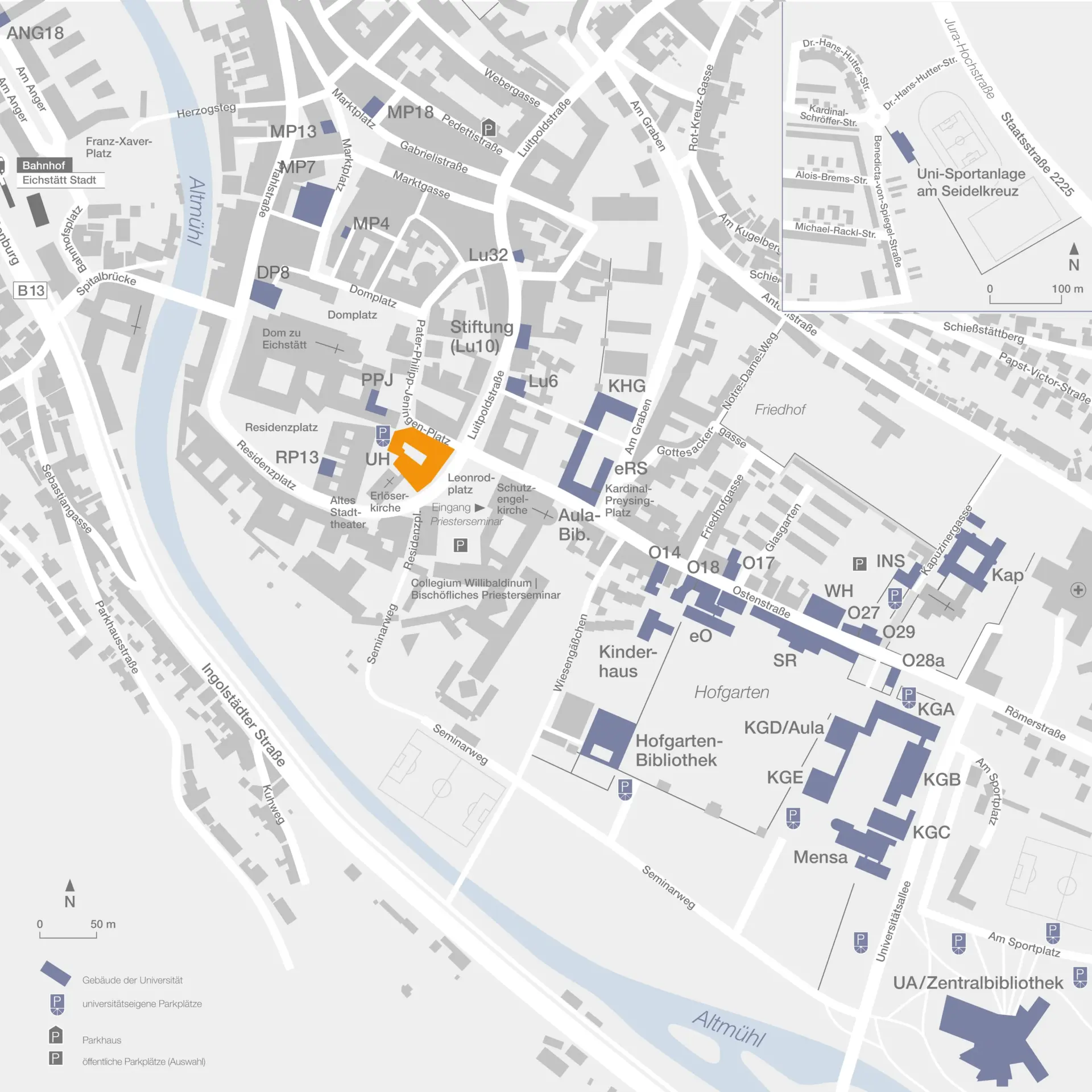 Seine heutige Gestalt verdankt er der Überformung durch Hofbaumeister Jakob Engel, die im Jahre 1688 auf Veranlassung der Domherren Karl Ferdinand und Ernst von Ulm zu Erbach erfolgte – das Gebäude trägt bis heute ihren Namen. Die Geschichte der geistlichen Hausherren endete mit der Säkularisation. Zunächst in Privatbesitz, ging der Ulmer Hof 1842 an das Königliche Humanistische Gymnasium, das spätere Willibald-Gymnasium, über. Nach dessen Umzug in ein neues Schulzentrum übernahm die Katholische Universität im Jahre 1977 das frei gewordene Gebäude zur Nutzung als Lehr- und Verwaltungsgebäude der Theologischen Fakultät. Im ehemaligen Innenhof fand die Teilbibliothek 1 mit einem Freihandbestand von derzeit etwa 105 000 Bänden und ca. 2 000 Medien zur Theologie, Philosophie und Musikwissenschaft ihr Unterkommen. Die Bibliothek als neues Herzstück des alten Domherrenhofes ist durch die Arkaden im Erdgeschoss des Nordflügels erlebbar. Leicht schlierige Brandschutzverglasungen verzerren den Anblick, scheinen zunächst die Illusion einer Bibliothek zu erwecken. Diese entscheidende Schnittstelle zwischen Alt- und Neubau, zwischen Geschichte und Gegenwart bedingte hohen technischen Aufwand. Denn eine Freilegung der Arkaden war erst nach umfangreicher statischer Sicherung durch Pfahlgründung des Nordflügels sowie durch Unterfangung seiner Obergeschosse möglich. Die hierfür erforderliche Stützkonstruktion aus Stahlprofilen wurde hofseitig vor die Arkaden gestellt, folgt dem Rhythmus der Säulenstellung und behauptet sich doch als in Material und Form eigenständig ablesbare Ebene. Indem sie die Verglasung zwischen Flur und Lesesaal aufnimmt, ist sie Trennung und Verbindung zugleich. (Grund)