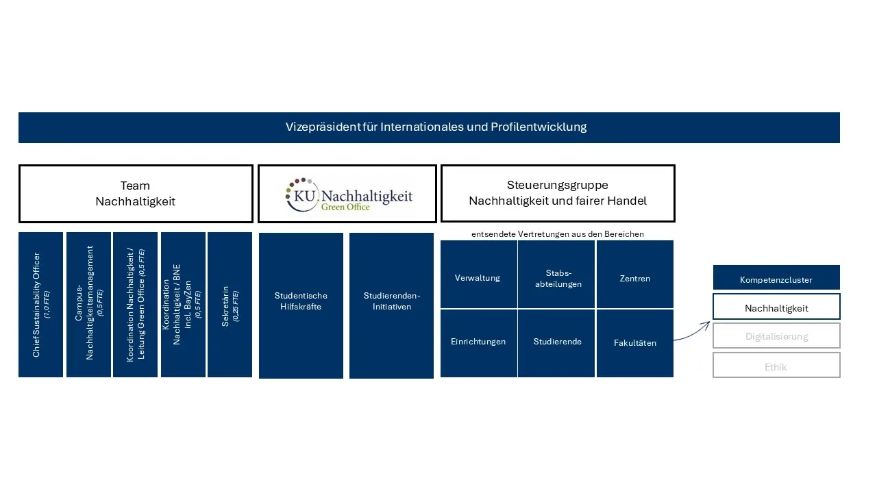 Die konsequente, nachhaltige und transparente Weiterentwicklung der KU ist ein zentrales Ziel des Nachhaltigkeitsgesamtkonzepts. Mit dem Anspruch, die sozial-ökologische Transformation aktiv mitzugestalten, setzt sich die KU für eine gerechte und zukunftsfähige gesellschaftliche Entwicklung ein und verankert dieses Engagement in klaren Strukturen und Maßnahmen. Deshalb verfolgt die KU einen Whole Institution Approach in den sechs Handlungsfeldern Lehre, Forschung, Transfer, studentisches Engagement, Campusmanagement und Governance. Um nachhaltige Entwicklung gesamtinstitutionell voranzutreiben, hat sie Organisationsstrukturen etabliert, die eine handlungsfeldübergreifende Umsetzung der Nachhaltigkeitsziele ermöglichen.