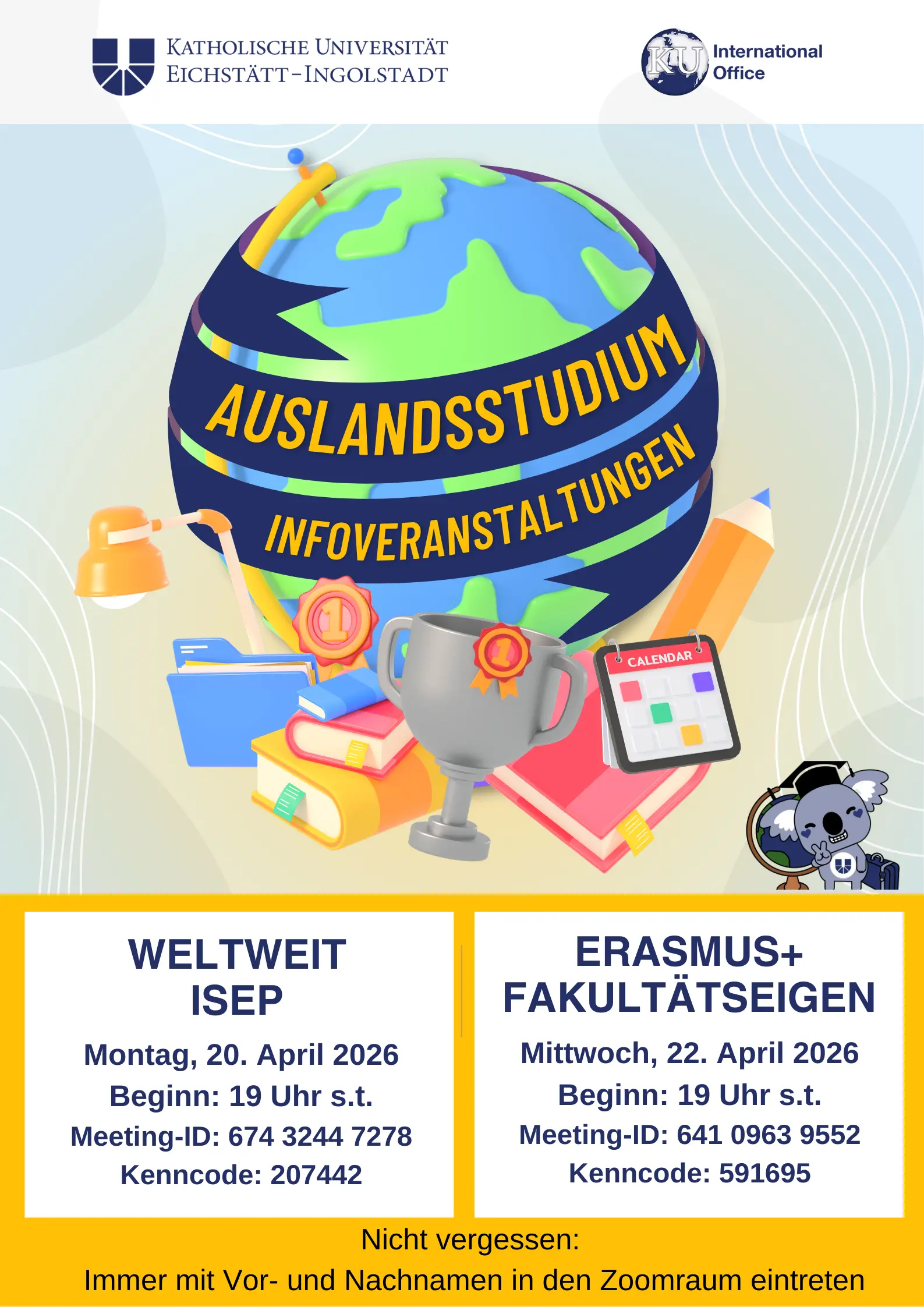 Alle Informationen zu Erasmus+ - für alle, die ein Auslandssemester innerhalb der EU machen möchten sowie alle Infos zu Fakultätseigen - für alle, die ein Auslandssemester in der Schweiz oder (nur für Studierende der WFI) in Asien machen möchten.