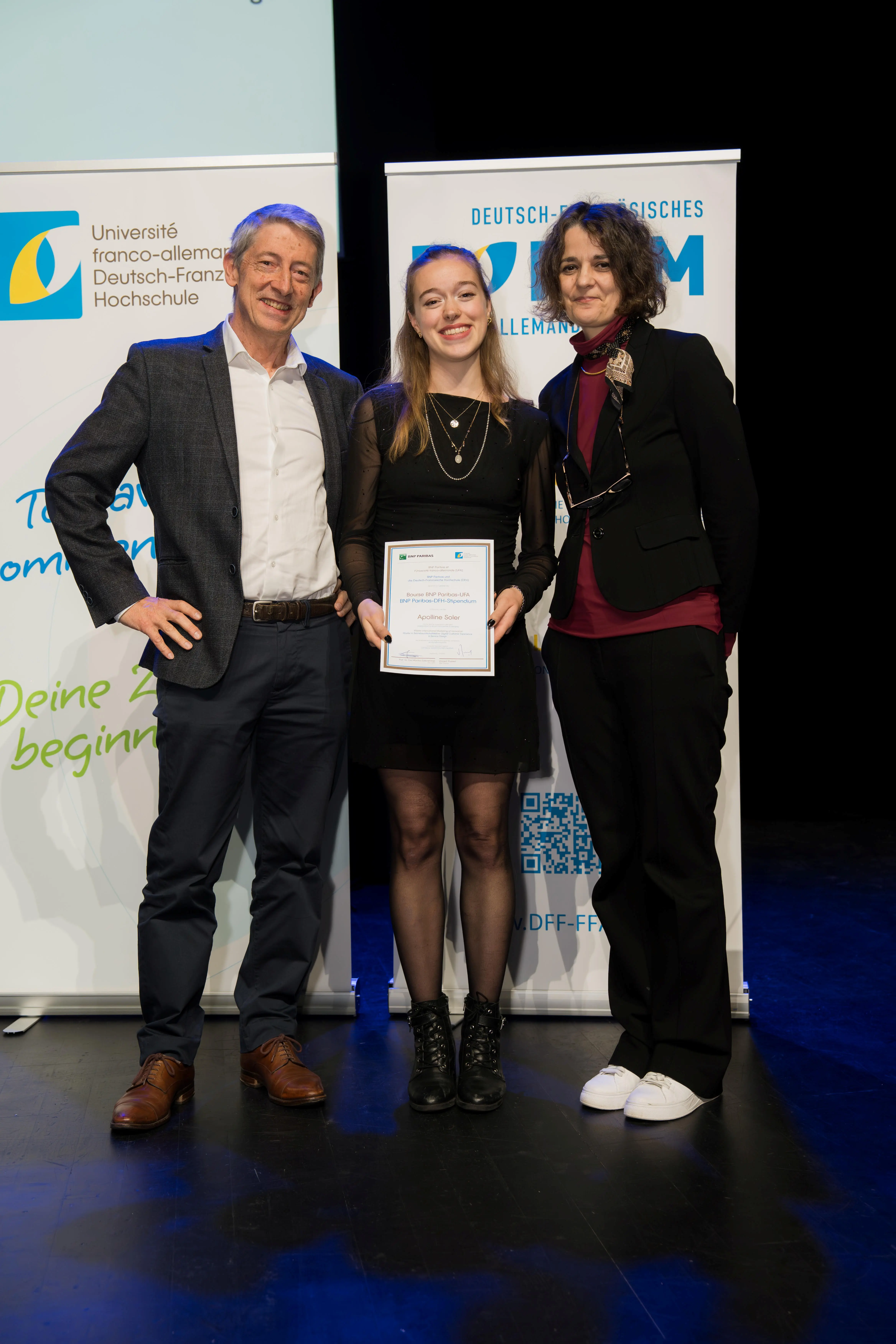 The award ceremony took place on 14 November 2025 during the opening session of the 27th Franco-German Forum in Strasbourg, held under the patronage of Philippe Gréciano, President of the Franco-German Forum and Vice President of the DFH. In addition to Apolline Soler, four other students enrolled in Franco-German study programmes received DFH scholarships funded by BNP Paribas, Ignite Group Germany, and the Germany–France Country Committee of Rotary International.