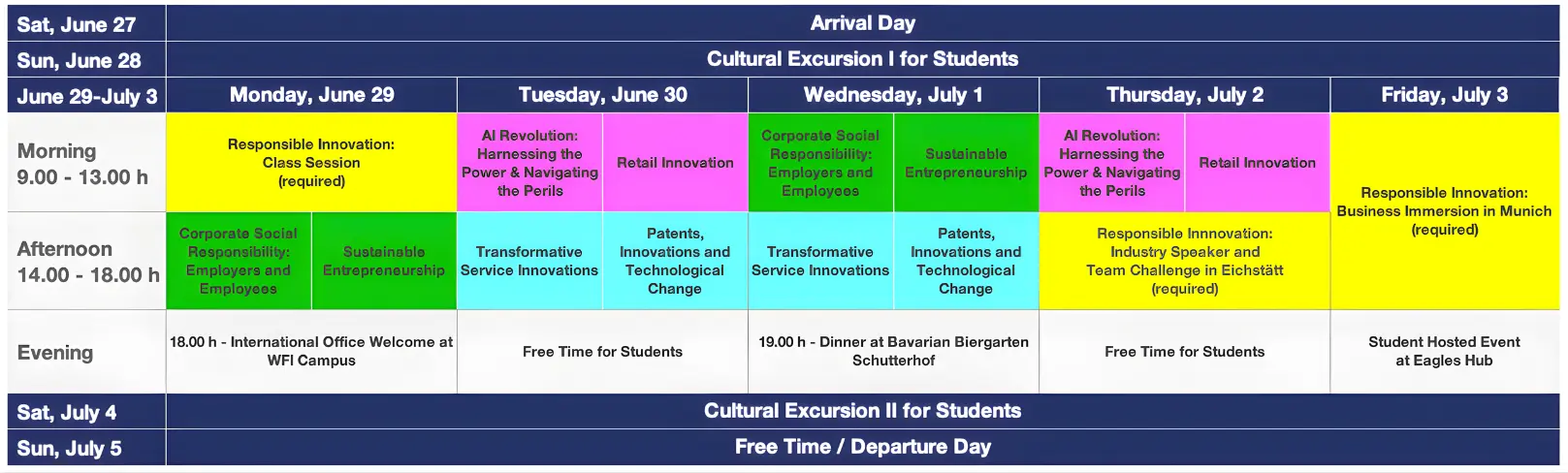 Studierende können bis zu 10 ECTS-Punkte bei der Wahl von 4 Kursen erwerben. Einer dieser Kurse ist ein übergreifendes Pflichtmodul zum Thema "Responsible Innovation" mit einem Unternehmensbesuch in München. Die WFI Summer School umfasst Networking-Veranstaltungen mit Vordenkern, kulturelle Exkursionen und Zeit für Reflexion.